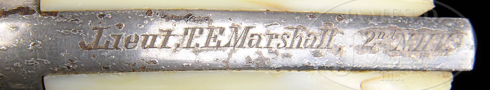 CIVIL WAR INSCRIBED SMITH & WESSON #2 ARMY REVOLVER. SN 26212. Cal. 32. This is a nice example of the popular Smith & Wesson Civil War sidearm with 6″ bbl with mother-of-pearl grips in “as found” fine condition. The gun has matching assembly numbers. Presentation engraved on backstrap reads “LIEUT T.E. MARSHALL 2nd NHV”. Lt. Thomas E. Marshall entered service in the 2nd New Hampshire Volunteers April 29, 1861 as a Private. Marshall was 23 years old at his time of enlistment. He was promoted to Sergeant in June 1861 and was wounded July 2, 1863 at the Battle of Gettysburg and during their engagement at the “Peach Orchard.” He was promoted to Lieutenant of Co I on June 24, 1864, when he must have received this gun, and he was later promoted to Captain just before war’s end, April 27, 1865. He continued in service and was mustered December 19, 1865. The 2nd New Hampshire was a hard-fought unit as part of “Fighting Joe Hooker’s” division; the 2nd had over 100 casualties in its maiden battle at Bull Run June 21, 1861. Marshall fought at Fredericksburg, Cold Harbor, & Petersburg being one of the first regiments to enter Richmond. There is a large file of research materials including Marshall’s war records detailing the numerous battles he was part of and two orig ordnance forms from Oct 1864, one signed by Lt. Marshall and the other listing his company’s gear along with other Lieutenants of the regiment. Also included is a rare 1st edition regimental history of the 2nd Regiment New Hampshire Volunteers written by Martin Haynes in 1896; Marshall is mentioned and his photo is in this book. PROVENANCE: Marlan Polhemus Collection. CONDITION: Gun retains about 90% of its original silver finish on frame and bbl with staining and pitting and some bubbling. Cyl retains traces of silver finish with balance gray/brown. Maker and patent marks on bbl flat and cylinder are crisp and easily read as are serial numbers. Pearl grips are sound and solid with two chips at outside toes on each. Mechanically gun functions partially as it will not hold cock and indexes sporadically. Rifling in bore is crisp and distinct. Accompanying ordnance documents are in very good condition overall. Regimental history is sound and solid, ex-libris, minor staining and foxing. 4-48740 JS61 (5,000-7,000)