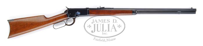 *FINE WINCHESTER 1892 STANDARD GRADE LEVER ACTION RIFLE. SN 374455. Cal. 25-20 WCF. 24″ round bbl, full magazine, half nickel front sight with set screw, serrated side sporting rear with set screw, standard receiver, mounted with straight grain uncheckered straight grip stock with crescent buttplate and standard rifle forend. PROVENANCE: Dr. Frank Miller Estate Collection. CONDITION: Extremely fine. Bbl and mag tube has 97-98% original blue, faint muzzle wear and a few light minor nicks and scratches. Receiver has 96-97% original blue with faint sharp edge wear, a few tiny spots of oxidation on left side of receiver, a group of minor scratches on right side. Loading gate retains virtually all of its nitre, hammer has strong original case colors with some striation worn to silver on left side, lever has most of its original case colors with some slight thinning across bottom. Stock is solid with a few minor nicks and dings and two minor depressions on right side and most of its original finish. Buttplate has fading original colors mixed with gray patina. Forend is sound with minor light nicks and dings and a few insignificant scratches, most of its original finish with a small area of wear on bottom. Forend cap and screws have most of their original finish. Mechanics are crisp and bore is bright and shiny as gun has seen little to no use. 4-35712 BDT126 (3,000-5,000)