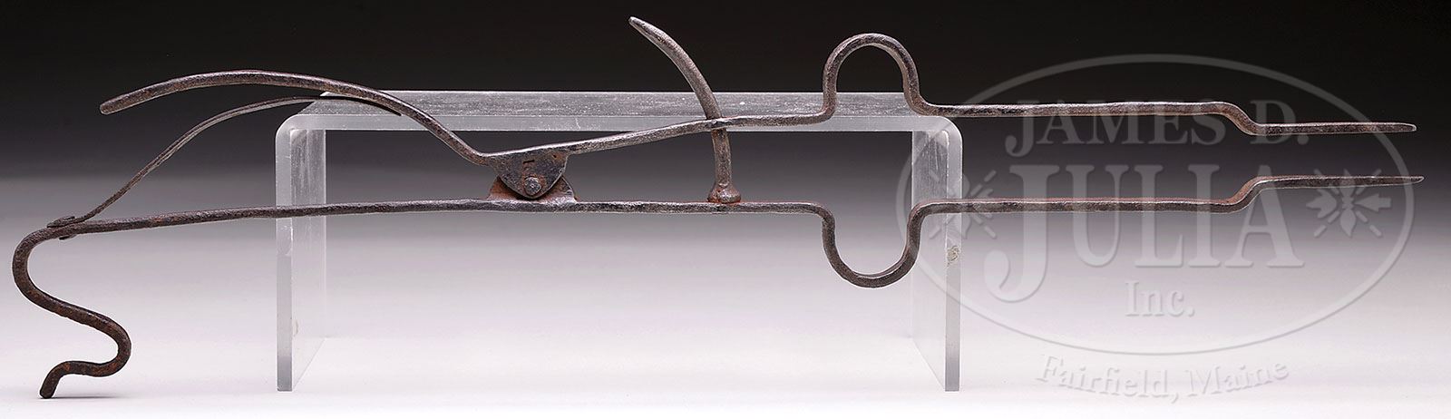 RARE EMBER PIPE TONGS. Mid-18th century, New England. Finely wrought forged iron spring loaded snake head tongs. With lobed central design and elongated pincers. SIZE: 21″ l. CONDITION: Of slender form and proportions. In untouched patina. Very good. 9-29155 (1,200-1,600)