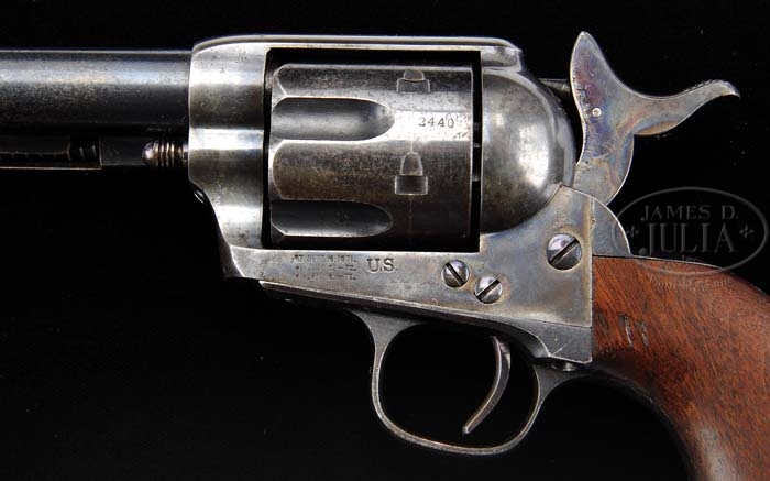 Correction to Printed Catalog: There is a small re-glued chip at Toe of left grip panel. MARTIALLY MARKED COLT CAVALRY SINGLE ACTION ARMY REVOLVER. SN 112440. Cal. 45 Colt. Blue & case color hardened with 7-1/2″ bbl, full front sight with 1-line block letter address. Bottom of bbl has “D.F.C.” (David F. Clark) sub-inspector initials and last four digits of the serial number under the ejector rod housing. Ejector rod housing is 2nd type with bull’s eye ejector rod head. The “D.F.C.” initials are also found on the cylinder, bottom of frame and bottom left edge of grip. Trigger guard & butt strap have the mystery “G” inspector initial. Left side of the frame has 3-line patent dates with a small “U.S.”. Mounted with a beautiful 1-pc walnut grip that has crisp “FH” (Capt. Frank Heath) inspector cartouche under the date “1884” on left side and the “DFC” cartouche on right side. This series of Cavalry Colts usually saw hard service on the frontier with some being issued to various militia units. Rarely are they found with strong orig finish. CONDITION: Very fine, all matching except grip which is unnumbered but is obviously correct and fits perfectly. Bbl & cyl retain 90-92% orig blue with fine flaking that is turning to medium patina. Both sides of front sight and ejector rod stud retain visible feathers in the finish. Ejector rod housing retains most of its orig factory blue with some slight thinning on outer radius. Frame & hammer retain most of their orig case hardened colors, brilliant in sheltered areas, strong and turning dark elsewhere. Grip frame retains dull blue/brown finish with freckling on back strap, strong blue in sheltered areas. Grip is outstanding showing light wear with minor chips & scratches and retains both crisp cartouches and date with most of its orig oil finish. Mechanics are crisp, brilliant shiny bore. 4-38597 (30,000-40,000)