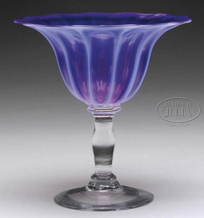 SIGNED LIBBEY COMPOTE. Amethyst bowl with opalescent vertical ribbing and an applied clear crystal stem and foot. Signed on the underside with acid etched “Libbey” insignia. SIZE: 7″ dia x 7-1/4″ t. PROVENANCE: From the Private Collection of Dorothy Lee Jones. CONDITION: Very good to excellent. 5-61845 (200-400)