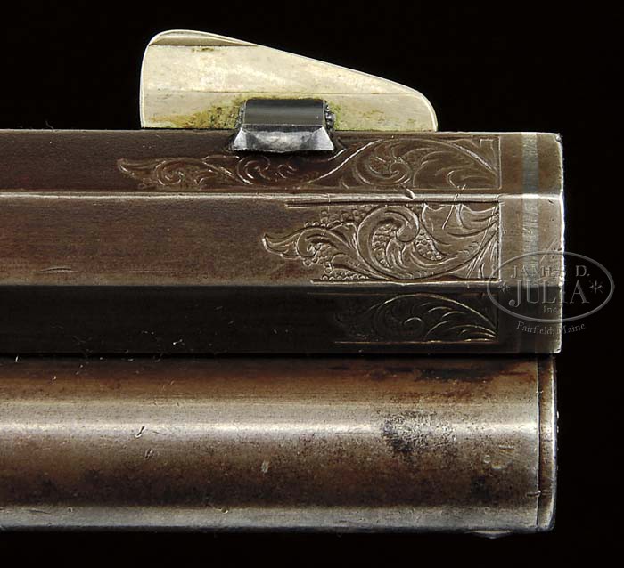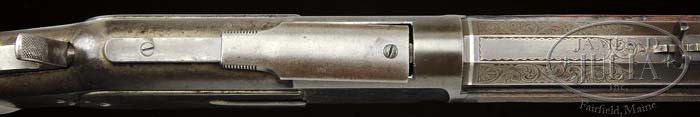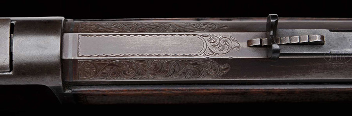 EXTREMELY RARE WINCHESTER MODEL 1873 DELUXE “ENGRAVED LIKE 1 OF 1000” LEVER ACTION RIFLE. SN 73522. Cal. 44 WCF (44-40). Fine 2nd Model ’73 with rare 30″ oct bbl, full magazine, German silver Rocky Mountain front sight, orig, short, semi-buckhorn rear sight with checkered edges and a thick base tang sight with 4″ staff. Mounted with beautiful flame grain American walnut with early style checkered forearm and pistol grip buttstock with fleur-de-lis inlay and crescent buttplate with trap. Receiver is 2nd type with screwed-on dust cover rail and smooth dust cover without thumbprint. Left side of lower tang, under the wood, is stamped with assembly number “1655” and “XXX”. Top tang channel of buttstock has the assembly number “780” which number is also found inside toe of buttplate. The bbl, over the chamber area, is engraved like a 1 of 1000 with engraving extending about 2-5/8″ over the top three flats with lesser patterns on the side flats. Top flat of the bbl is engraved to match around front sight which extends about 2-3/8″ from the muzzle. The top flat has a blank panel that would have contained “1 of 1000” or the engraved caliber on other “Engraved Like” rifles.The observed panel measures precisely the same as if it had a 1 of 1000 inscription. The three side flats are also engraved to match. The muzzle & chamber ends of the bbl are inlaid with wide silver bands. This rifle is pictured on p. 124 of WINCHESTER The Golden Age of American Gun Making and the Winchester 1 of 1000, Wilson, with credit to the Donald M. Yena Collection. It is further identified, by SN, in a chart on p. 126 of the book The Story of the WINCHESTER 1 of 1000 and 1 of 100 Rifles, by Edmund Lewis, and where the barrel engraving is shown on p. 125. Dr. Lewis states in the book that there were 23 Model 1873 “engraved like” rifles listed in the warehouse ledgers. This chart shows that 10 of these Model 1873 “engraved like” rifles, including this one, were shipped on the same day to the same order. The chart also shows three others that were delivered to another order and five more that were delivered to a third order. This chart also discloses that there were only 2 of these 23 rifles fitted with 30″ bbls. According to Dr. Lewis’ book there is very little known of the “engraved like” rifles such as whether there was even an extra charge for them, as apparently no records exist beyond the shipping records. It seems likely that Winchester had a supply of bbls on hand when the 1 of 1000 and 1 of 100 line was no longer offered and being the frugal company they were known to be, never threw anything away and apparently made them available as late as 1886. Accompanied by a Cody Firearms Museum letter identifying this rifle as case hardened with 30″ oct bbl, set trigger, checkered stock with pistol grip, “engrave barrel like 1 of 1000”, shipped with nine other Model 1873s on Work Order #26575. The letter also lists the 10 SNs in this shipment. It was received in the warehouse Sept. 12, 1881 and shipped next day. PROVENANCE: Joe Bates; Donald M. Yena; Paul Sorrell; Ray House; Walt Halstein and Dr. Edmund E. Lewis Collections. CONDITION: Very good. Bbl & magazine tube retain a thin plummy/brown patina with a few minor, very light nicks; receiver retains traces of silvered case colors in sheltered areas being mostly a smooth light plummy brown patina; lever & hammer are a matching patina; wood is sound with a few light nicks & dings and retains about half of an old restored finish on the buttstock with the forearm being a hand worn patina; checkering shows heavy wear. Mechanics are fine, strong bore with sharp rifling and fine pitting, may clean better. 4-44929 JR491 (60,000-75,000)