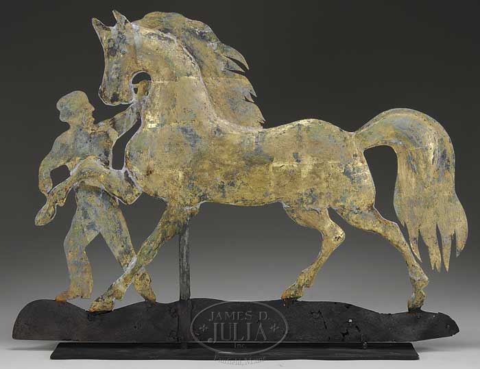 HORSE AND GROOM COPPER WEATHERVANE ATTRIBUTED TO A.L. JEWELL. Late 19th century. A.L. Jewell and Company, Waltham, MA. This nice example a combination of full body and sheet copper elements in silhouette on a sheet iron laminated base. Mounted on museum stand. SIZE: 23-1/4″ h x 32″ l. CONDITION: Structurally good with verdigris and gilded surfaces that appear to be untouched. Sheet iron base or foundation with considerable rust and weaknesses and with old repairs. Otherwise good. 9-25621 (8,000-12,000)