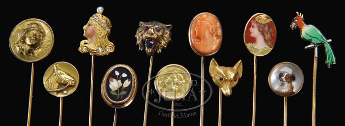 ELEVEN ANTIQUE STICK PINS. Outstanding lot of antique gold stick pins features a beautiful enameled and diamond Art Nouveau lady’s head, a finely enameled and gilt portrait of Mercury, an exceptional reverse painted on glass dog’s head, a $1 Liberty gold piece, horse head with single cut diamond, coral cameo, Pietra Dura and more. SIZE: Approx. 2-1/2″ l. PROVENANCE: From the Estate of Geraldine Gaba, Scottsdale, AZ. CONDITION: Overall very good with some damage to enamel on Art Nouveau lady’s nose. 5-68377 (300-500)