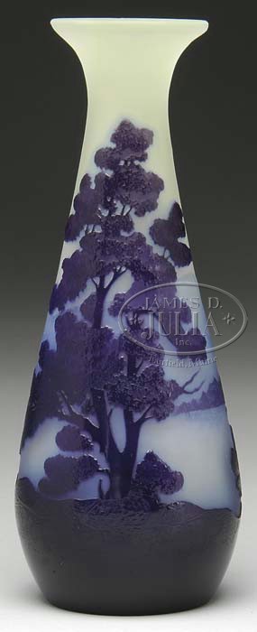 GALLE FRENCH CAMEO VASE. Elongated teardrop shaped vase has a flared rim and is decorated in serene blues and purples on a soft yellow ground. Design is trees and foliage in the foreground with the background having a mountain range. Carved on the side “Galle” in script. SIZE: 8″ t. CONDITION: Very good to excellent. 5-64645 (3,000-4,000)