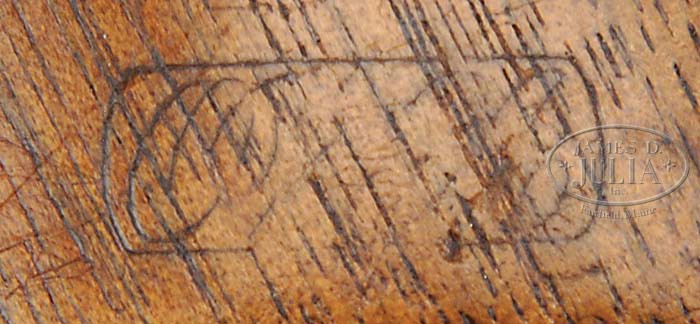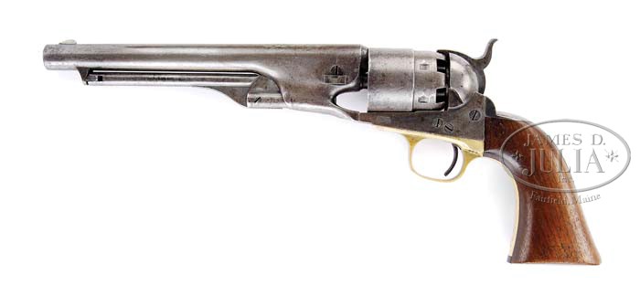 MARTIALLY MARKED COLT MODEL 1860 ARMY PERCUSSION REVOLVER. SN 37552. Cal. 44. Usual configuration with 8″ rnd bbl, German silver front sight and 1-line address. Left side of frame is marked “COLTS PATENT” and it has brass trigger guard with iron back strap containing a 1-pc walnut grip with last four digits of SN in back strap channel. Left side of grip has a partially legible “OWA” (Orville W. Ainsworth) cartouche and there are small inspector initials on various parts. Frame is 3-screw style cut for shoulder stock with flat head hammer screw and stock lug notch in heel of butt strap. The model 1860 Army was one of the most popular and prolific side arms in use during the Civil War with over 125,000 purchased by the Union government, most of which saw hard military service and later on the frontier during the great Westward expansion during the Indian wars. PROVENANCE: John Irwin Estate Collection. CONDITION: Very good, all matching including grip with wedge properly unnumbered. No orig finish remains on bbl, rammer or cylinder with cylinder retaining 40-50% Ormsby Naval battle scene and a few spots of light pitting. Frame retains 40-50% faded case colors, stronger on left side. Back strap is a mottled silver/brown patina and trigger guard a light mustard patina and does not appear to have been silver plated. Grip is sound showing light to moderate wear with light nicks & scratches and a fine hand worn patina. Mechanics are crisp, replaced hammer screw & hammer spring, strong bore with good shine and moderate to heavy pitting. 4-36790 JR69 (2,500-4,000)