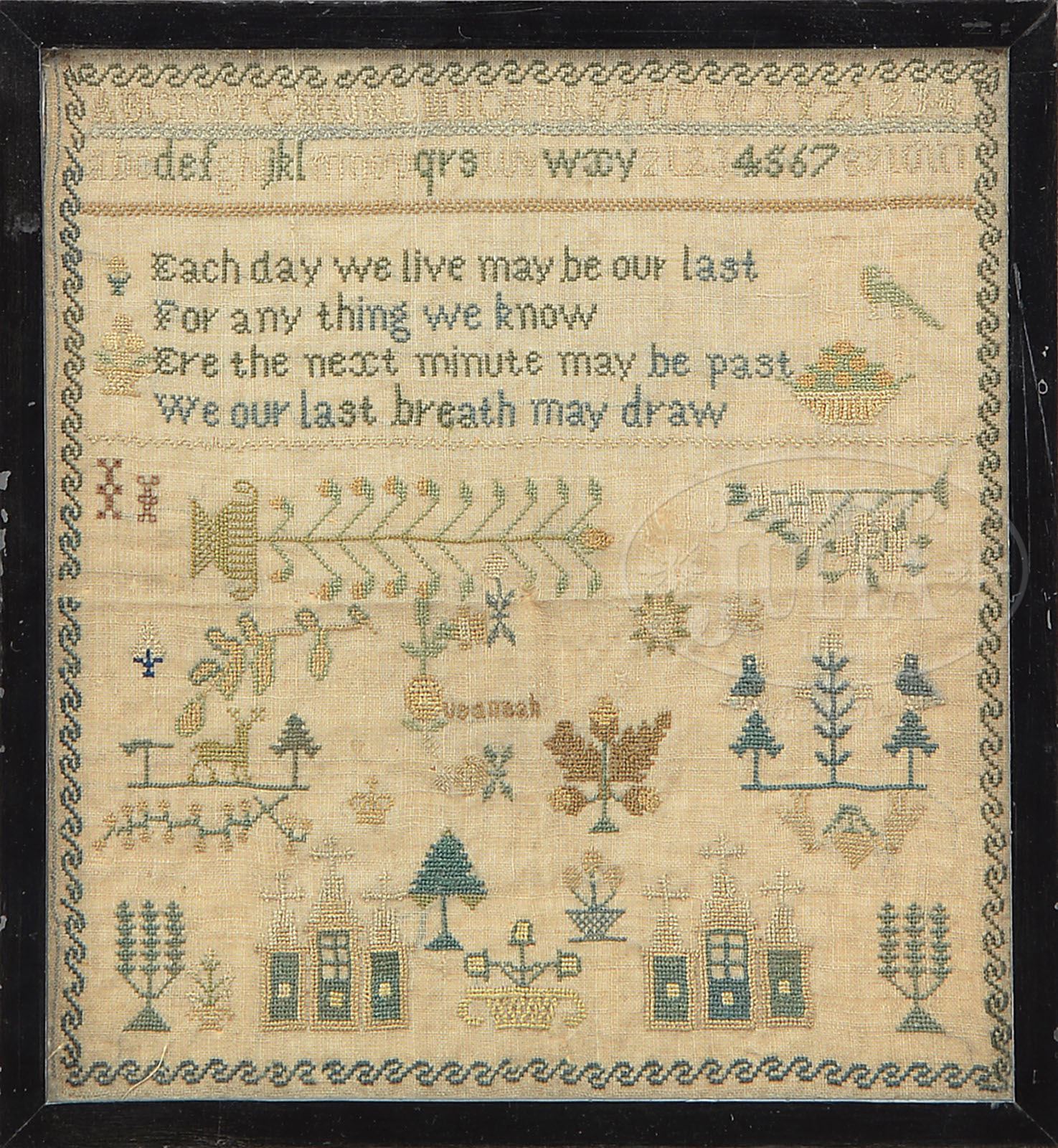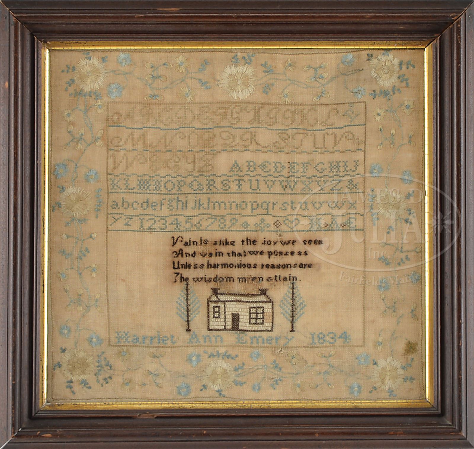 GROUP OF THREE SAMPLERS. 19th century. The first wrought by Harriet Ann Emery in 1834. Wrought with rows of letters and numbers above four lines of verse above a country home flanked by stylized trees, all within a nicely wrought floral border in shades of pale blue and cream mounted within a Victorian walnut frame. The second a sampler of verse and prayers wrought by Mary Ann E. Topham, Cambridge. All within a scrolling finely wrought floral border. The third a pictorial sample beneath lines of alphabet and verse depicted with bowl of fruit, flowering plants within urns, a crown, deer in a landscape, and a dog. Embroidered with the name “usannah” within a scrolling border. SIZE: 1) Sight: 16″ x 17-1/4″. 2) Sight: 15-3/4″ x 15-3/4″. 3) Sight: 10″ x 9-1/2″. CONDITION: The first with staining in area of verse. The second with some minimal deterioration to foundation. The third with minor and minimal insect damage to foundation. All three with some toning, otherwise good. 9-29139 (1,000-2,000)