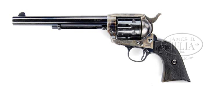 *PRE-WWII COLT SINGLE ACTION ARMY REVOLVER. SN 302242. Cal. 45 Colt. Blue & color case hardened finish with 7-1/2″ bbl, full orig front sight with 1-line block letter address and caliber marking on left side. Left side of frame has 2-line, 3-patent dates with rampant Colt in a broken circle. Mounted with orig rampant Colt hard rubber grips numbered to this revolver. Accompanied by a Colt factory letter identifying this revolver as found with type of stocks not listed, sold to J.C. Sudder, address unavailable, shipped to H & D Folsom Arms Co., New York, NY, Nov. 1, 1907 in a one gun shipment. CONDITION: Extremely fine, bbl & ejector rod housing retain about 98% glossy orig blue with muzzle edge wear and wear on tip of ejector rod housing. Left side of bbl is slightly thinned with a couple of minor scratches. There are visible feathers on each side of front sight and each side of ejector rod stud. Frame & hammer retain about all of their orig factory case colors, brilliant in sheltered areas, moderately faded elsewhere, turned silver on top edge of hammer. Back strap is slightly thinned with heel edge wear and front strap is a blue/gray patina with dark glossy blue elsewhere on grip frame. Cyl retains 92-93% thinning glossy orig blue with several scrape lines around circumference, strong bright blue in the flutes. Grips are crisp showing light wear beginning to turn chocolate on right side. Mechanics are crisp, bright shiny bore. 4-38595 (13,000-16,000)