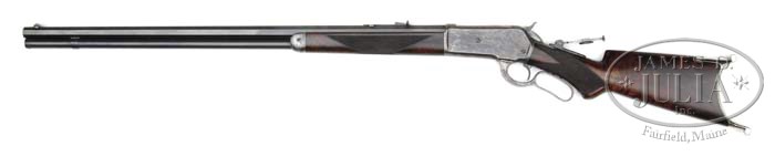 SCARCE SPECIAL ORDER WINCHESTER MODEL 1886 LEVER ACTION RIFLE. SN 61240. Cal. 45-90. Fine deluxe ’86 with 30″ oct bbl, full magazine, Lyman ivory bead hunting front sight, flat top sporting rear sight and mid-range vernier tang sight. It has sgl set trigger. Mounted with extremely beautiful, center crotch, flame grain American walnut with “H” style checkered forearm and serpentine pistol grip stock with black triangle insert and nickeled brass Swiss buttplate. Left side of lower tang is stamped with assembly number “211” and “XXX”. Matching assembly number is found inside top tang channel of buttstock and inside buttplate. Accompanied by a Cody Firearms Museum research request yellow sheet which identifies this rifle in caliber 45-90 with 30″ oct bbl, set trigger, checkered pistol grip stock, Swiss buttplate and mid-range vernier sight, received in warehouse Sept. 2, 1891 and shipped same day to order #9907. This fine rifle has been completely restored. CONDITION: Very fine, completely restored, as noted, with the bbl & magazine tube retaining about all of this restored finish; receiver & lever retain all of their restored case colors; buttplate retains about 97-98% strong orig nickel; wood has a repaired chip back of top tang, another repaired chip atleft side of top tang at the receiver, otherwise is sound and retains about all of its fine restored finish. Mechanics are fine, worn dark bore. 4-45170 (8,000-12,000)