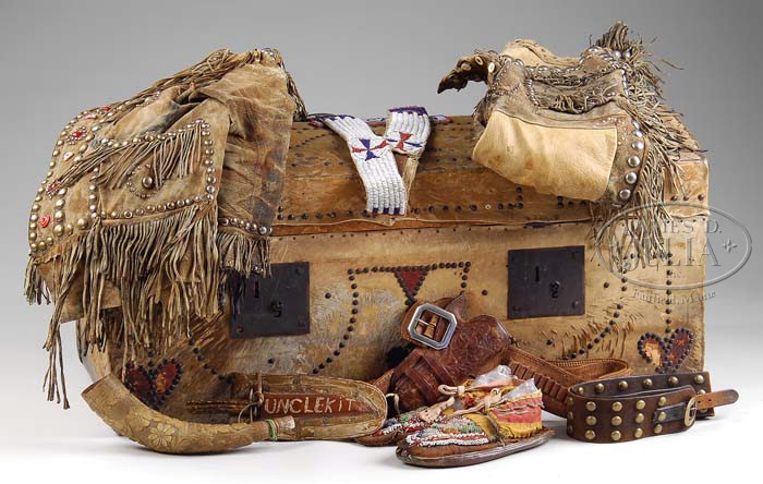 *LARGE HIDE COVERED TACK DECORATED TRUNK FULL OF MEMORABILIA AND FIREARMS OF WILLIAM “KIT” CARSON “UNCLE KIT”, NEPHEW OF FAMOUS SCOUT & EXPLORER COLONEL KIT CARSON. 1) Cal. 32 WCF (32-20) SN 250538. Standard grade rifle with 24-1/4″ round bbl, full magazine, replacement ivory blade Rocky Mountain. front sight and standard rear sight. Mounted with straight grain, uncheckered American walnut with straight stock and crescent butt plate without trap. 2) Colt SAA revolver. Cal. 41 Colt. SN 195264. Usual configuration with 5-1/2″ bbl, one line block letter address and altered front sight. Left side of the frame has two line, three patent dates with rampant Colt in a broken circle. It is mounted with two piece smooth ivory grips and the backstrap is electric pencil engraved “UNCLE KIT CARSON”. 3) Fine old brain tanned buckskin jacket with long fringes on numerous places. Both sides of the front opening around the pockets and cuffs are mounted with nickeled brass studs and red synthetic stones. It also has triangular shaped fake shell buttons. Also accompanied by the original buckskin pants decorated identically with suspender buttons and fine tan deerskin front of the legs. Also there is a beautiful beaded blanket strip belt with primary white beads with blue, yellow and red accents. Red beads are the earlier style white hearts. Additionally accompanied by a beaded armband and a brass studded belt, along with a pair of well worn man-sized moccasins, beaded with large trade beads and lined with yellow trade cloth. Outside of the heel area also has a band of red trade cloth. For the revolver there is a mail ordered dbl loop holster and cartridge/ money belt with nickeled brass cut-cornered buckle. There is also a small Sheffield bowie knife w/ 6-3/4″ clip point blade, oval German silver hand guard and stag scales in a leather scabbard marked on the outside “UNCLE KIT”. Also accompanying is a deep carved cow’s horn powder horn and a pair of early cloth suspenders. And finally accompanying is a very large lot of ephemera including numerous letters, documents, postcards and myriad of early photographs along with show bills, etc.. William Kit Carson was born Aug. 7, 1858 at the Fort Union, New Mexico Army Post to William & Maria Carson. William, a father was the youngest of four brothers and brother of Christopher “Kit” Carson, the famous Indian scout, western explorer & pioneer guide. William Kit Carson “Uncle Kit”, whose property is being sold here, recalls living at Fort Lodge during 1878 and was present when his uncle died from an arrow wound. William Kit Carson lived the early part of his life around Fort Union, his father was an army sgt. who taught the young Carson self-confidence and how to survive. When he was 14 years old, Kit became a Teamster at Fort Union and at Fort Bliss near El Paso freighting supplies for the army. Later, young Kit worked for local cattle ranchers herding cattle from Arizona Territory to New Orleans and then up into Montana and also the Cherokee Strip Territory. Young Kit also worked the Jingle-Bob Ranch in Roswell, NM Terr. and then for John Chisum’s ranch. He became acquainted w/ William Bonney, aka Billy the Kid, who also worked on Chisum’s ranch. Kit also was acquainted with Pat Garret who killed Billy the Kid and was himself killed in a later shootout. Kit drove stagecoaches in Lincoln County and was the first man injured in the bloody Lincoln County War. He married a Pueblo Indian maiden with whom he had a daughter who died at age 14. In 1878 Kit was stationed in Salt Lake City working for Gen. Nelson Miles of the 13th Cavalry who gave him a model 1873 Winchester. The rifle included in this lot is probably not the one presented by Gen. Miles as this rifle was not manufactured until 1887. William Kit Carson, who story is being told here, fought in two of the great Indian wars of the period, one being against the Sioux where in the Dakota badlands he was wounded in the leg and then against the infamous Chief Geronimo and the Apaches in the southwest. Kit Carson was a member of the scouting party with Pawnee Bill (Gordon W. Lillie) and in 1886 he was a scout under Captain Lawton who captured Geronimo in the Dragoon Mountains. When the Spanish-American war broke out, Kit Carson joined the army and was assigned to the #7 pack train that was present throughout the entire Cuban campaign and claims to have ridden with the Rough Riders in the charge up San Juan Hill. In the fall of 1901, his unit was assigned to Fort McKinley in the Philippines where he remained for two years freighting supplies to the front lines. After the Philippines, he returned to NM where he became a miner, trapped & hunted, and lived with the Indians. In 1902 he joined the Coleman circus & toured in America & Europe for several months. In 1907 he and a group of Indians toured with vaudeville shows around the Pittsburgh, PA area. They stayed on the road for 12 weeks and then returned to NM. Shortly after that Kit was approached to join Buffalo Bill Cody’s Wild West, Cody having been a friend of Kit’s father. They asked Kit to be in charge of the Indians in the show because he spoke 6 Indian languages and knew sign language of all the tribes. He traveled w/ Buffalo Bill troupe for 5 summers and made 5 trips to Europe w/ them. After that, until 1930, he traveled w/ various shows and vaudeville troupes, and at age 72 retired to NM. And in 1931 moved to Roswell where he spent his remaining days. He died in 1957 at age 99. Also included in this lot is a letter dated Jan. 1, 1934 on “PAWNEE BILL’S OLDTOWN” letterhead addressed “FRIEND CARSON” asking him to go on the road with him to perform at the World’s Fair in 1934 saying that the 1933 fair had been extended and he was bidding to perform there. It is signed “G. W. Lilley”. One other item of interest is a photograph or possibly a copy of a photograph of an extremely young Roy Rogers with the sent