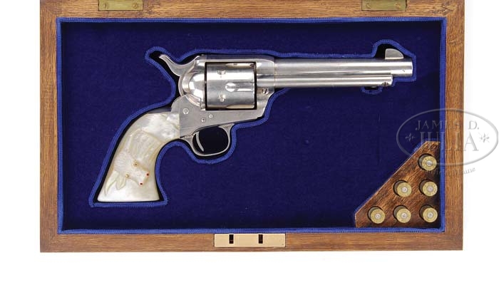 *FINE PRE-WAR, FIRST GENERATION COLT SINGLE ACTION ARMY REVOLVER. SN 352068. Cal. 45 Colt. Nickel finish with 5-1/2″ bbl, full front sight, 1-line block letter address and caliber marking on left side. Left side of frame has 2-line 3-patent dates and rampant Colt without circle. Mounted with beautiful 2-pc pearl grips that has a deep relief carved ox head on right side with gold eyes and red painted nostrils. Serial number was observed in the usual place on bottom front of frame and on the right side of front & back straps under the grip. Last two digits of SN are on rear face of cyl. Accompanied by a Colt factory letter identifying this revolver in 45 caliber with 5-1/2″ bbl, nickel finish, rubber stocks, shipped to Shapleigh Hardware Co., St. Louis, MO on Aug 3, 1929 in a one gun shipment. Also accompanied by a modern, blue velvet lined oak casing French fitted in bottom for revolver with a triangular cartridge block in right front corner containing six fired cases. PROVENANCE: Ted Knee Collection. CONDITION: Very fine, all matching except grips which are unnumbered. Overall retains 96-97% strong orig nickel, bright in sheltered areas, shows handling & use elsewhere with some dulling and minor losses around muzzle and end of ejector rod housing. Grips are outstanding & sound with great fire & color. Mechanics are fine, bright shiny bore. Case is new. 4-36624 JR393 (10,000-15,000)