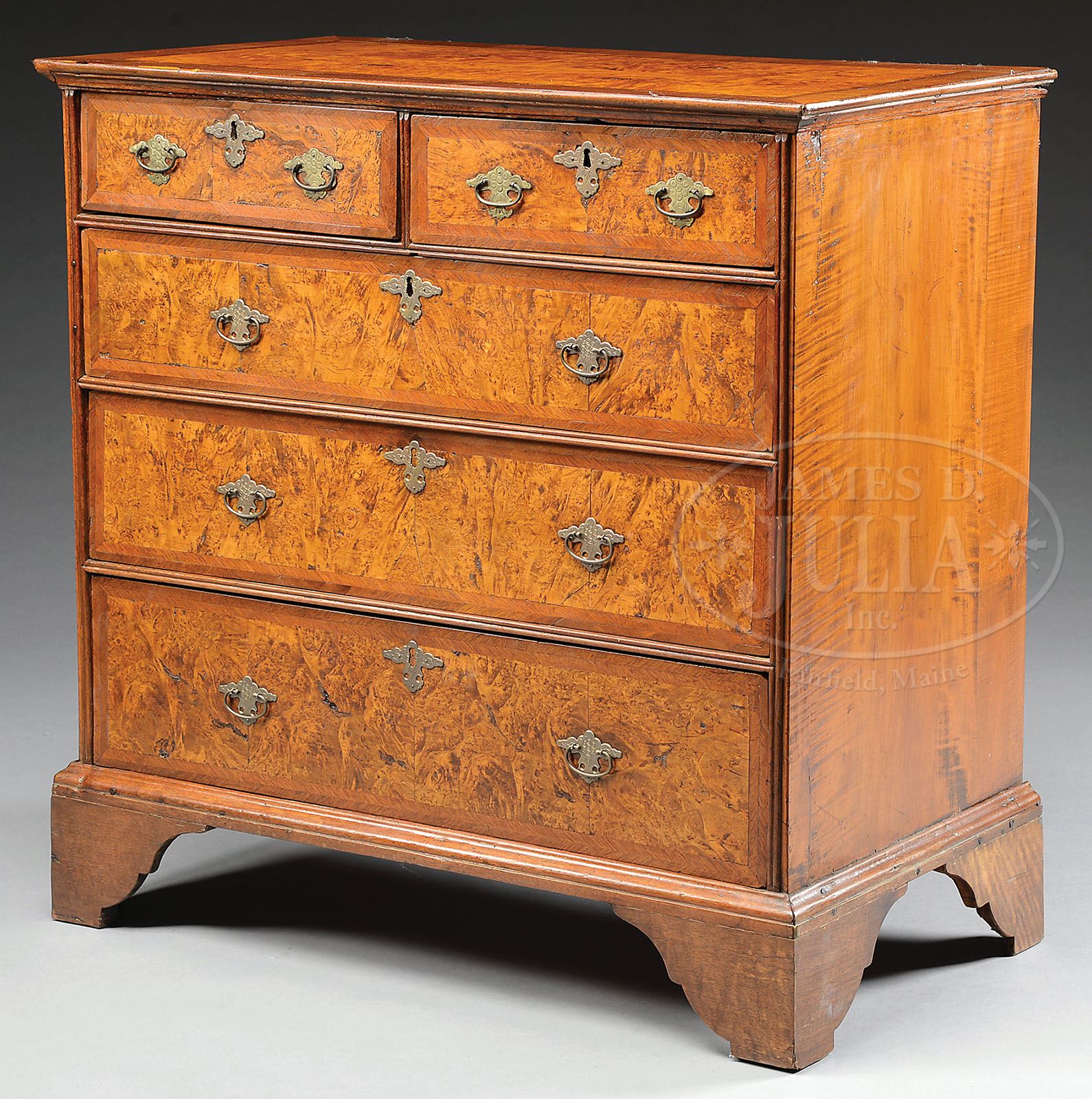 EARLY AMERICAN MAPLE AND PINE CHEST OF DRAWERS. 18th century, probably Massachusetts. The rectangular top with applied molded edge now with burl chestnut veneer panels within mahogany crossbanding above the conforming maple case fitted with two aligned pine short drawers over three long graduated drawers, each with inlaid burl panels and with mahogany and rosewood crossbanding on a molded base raised on figural mahogany veneered bracket feet with shaped returns. SIZE: 34-1/2″ h x 34-3/4″ w x 19″ d. CONDITION: Restored, repolished, and reveneered. 9-29641 (2,500-3,500)