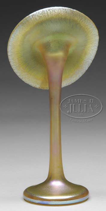 QUEZAL JACK IN THE PULPIT. Lovely Quezal Jack in the Pulpit vase has rich gold iridescence with strong pink highlights, while the face of the jack is bright gold with pink and green highlights. Signed on the underside in the polished pontil “Quezal”. SIZE: 8″ t. CONDITION: Very good to excellent. 5-62106 (2,000-2,500)
