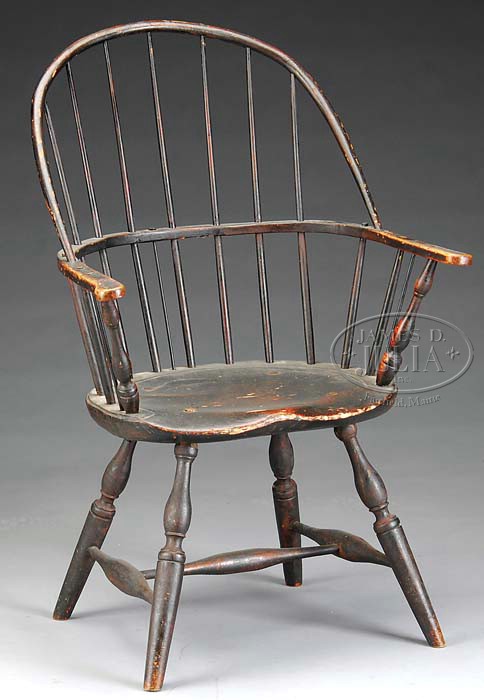 EARLY HIGH BACK WINDSOR BOWED ARMCHAIR. 18th century. Having bulbous turned stretcher base and bulbous turned arm support with high back support. having a wide-shaped seat and retaining a very old paint surface which appears to be brown over red. SIZE: 16″ to top of seat, 39″ to top of back. CONDITION: Structurally sound. Paint shows much age. 9-98462 (500-800)