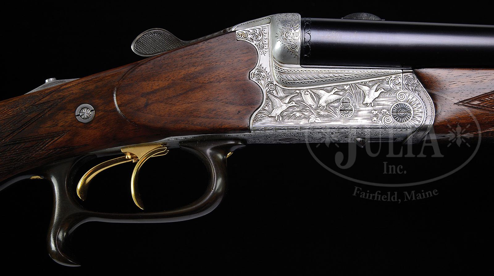 *J. WINKLER BOXLOCK VIERLING WITH CASE AND SCOPE. SN 421616. Cal. 20 x 20 x 7x65R x 22 Hornet. 23-1/8″ Bbls are fitted with full length matted rib mounting flip-up U-notch rear sight and claw scope bases. Bottoms of bbls are stamped with 1958 Ferlach proofs, calibers, steel type, and SN (42, the first digits denote manufacturer, Josef Winkler). A “W” is stamped on bottom bbl behind loop. Dural blitz scallop-backed action has rifle/ shotgun selector on top tang, Greener type side safety, crossbolt third fastener, bushed strikers, bolstered sides, and gold-plated double triggers (both set). Action is engraved with light Germanic scroll, some feather and geometric borders, and vignettes of game; a raebuck and doe on left, trio of mallards on right, and bellowing stag on bottom. Monogram “DR” is gold inlaid on top lever. Trigger guard is of horn, has rear finger spur, is affixed with gold-plated screws, and extends to composition grip cap. Nicely marbled, dark flesh-toned European walnut full capped pistol grip buttstock measures 14-3/8″ over brown Pachmayr open sided White Line pad, and features slight hog-backed fluted comb, right hand shadow line cheekpiece, skip line checkering, chinstrap transition from grip to butt, and a sling loop on toe line. Matching forend has Deeley release. Zeiss Diavari – Z 1.5 – 6 X 42 Scope with three post reticle is in claw mounts matching bases on bbls. Bore diameter: left-.623, right -.623. Bore restrictions: left -.035 (Full), right -.020 (Mod). Wall thickness: left -.022, right -.026. Drop at heel: 2-5/8″, drop at comb: approx 1-1/2″. Weight: 7 lbs. 3 oz. Weight with scope: 8 lbs. 10 oz. LOP: 14-3/8″. Leather case with brass plated corners and brass hardware, is lined in dark green cloth with Ferlach label in lid, and contains rubber-backed leather sling, round plated oil bottle, and some cleaning brushes, and target. CONDITION: Very fine. Bbls retain nearly all of a very high quality rust blue, most likely applied when new Zeiss scope was mounted. Action is bright polished, showing some wear and marks. Stock retains most of an older oil finish, edges slightly softened, checkering re-cut. All bores are excellent, Action is tight. Scope is near new with excellent optics, and new Recnagle rings. Case is very good with a number of marks, scrapes, and rubs. Interior cloth is fine, as are sling and accessories. 4-47696 MGM96 (7,500-12,500)