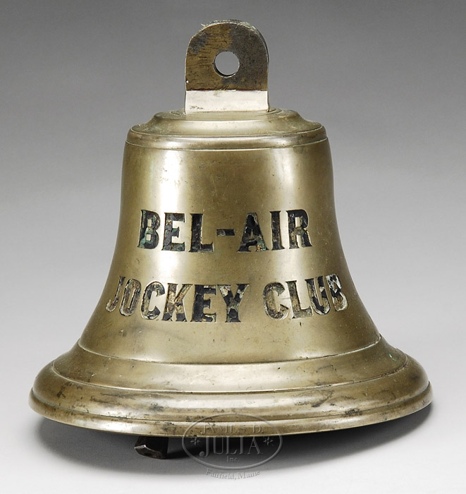 CAST-BRONZE BELL FROM THE BEL-AIR JOCKEY CLUB. Late 19th-early 20th century. Of typical form, engraved “BEL-AIR JOCKEY CLUB” and highlighted with black enamel paint. SIZE: 10-1/2″ h. x 10-1/2″ dia. CONDITION: Very good overall, with working clapper. Enamel paint within lettering mostly absent. 9-92726 (600-900)