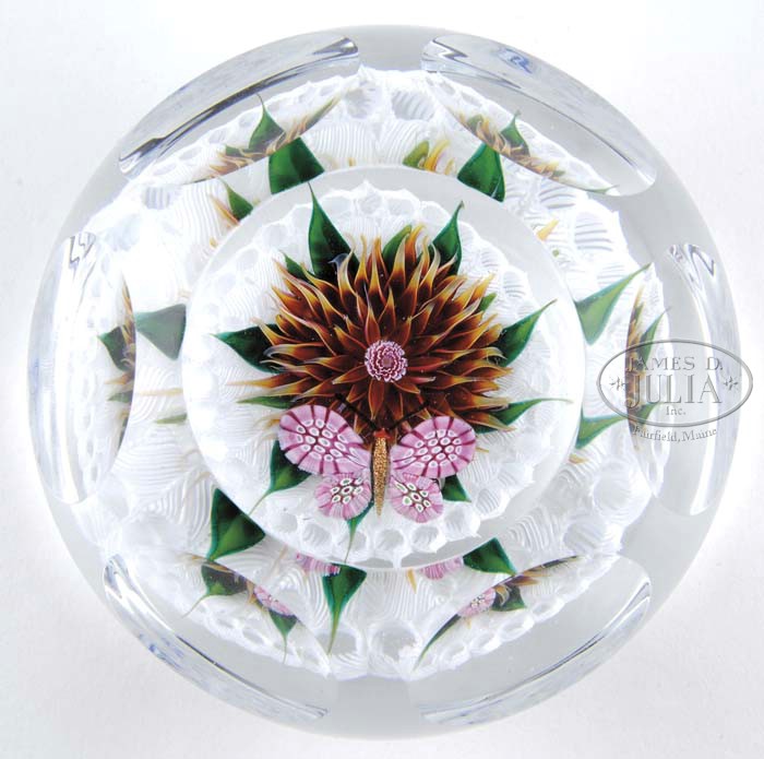DEBBIE TARSITANO DAHLIA PAPERWEIGHT. A pink and white millefiori butterfly hovers over a golden dahlia with green leaves. Blossom rests on a muslin ground. Paperweight has side facets and one top facet. Signed with a signature cane on underside. SIZE: 2-1/2″ t x 3-1/2″ dia. PROVENANCE: From the Estate of Bernard Piken; Boston, Mass. CONDITION: Very good to excellent. 5-62369 (500-700)