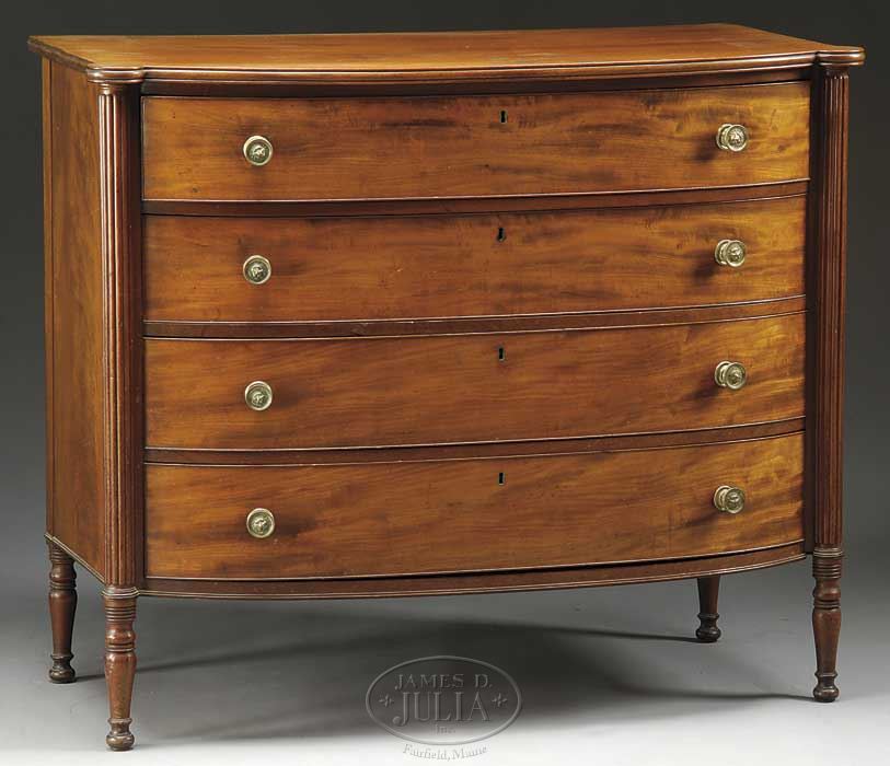 MASSACHUSETTS SHERATON CARVED MAHOGANY BOWFRONT CHEST OF DRAWERS. Second quarter 19th century. The rectangular top with molded edge and turret corners above the conforming case fitted with four long drawers with cockbeaded edges flanked by reeded pilasters raised on turned legs with ball feet. The chest with original brass knobs cast with lions’ masks. SIZE: 40-1/2″ h x 48″ w x 25″ d. CONDITION: Very good with rich color and patina. 9-25578 (700-900)