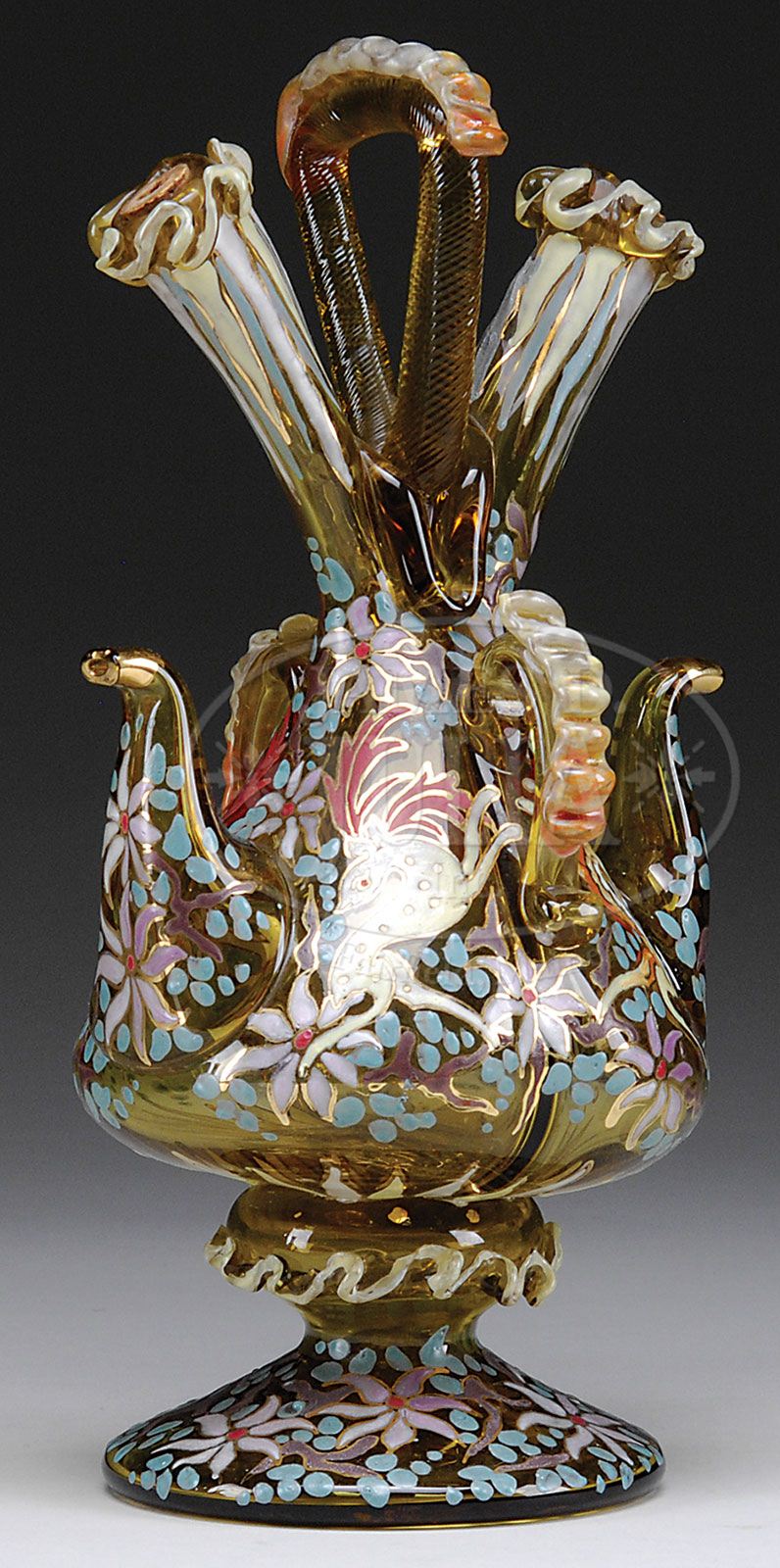 Correction: We believe this is Spanish Glass, not Moser. MOSER VINEGAR & OIL CRUET. Highly decorated cruet is all over enameled with floral decoration and four leaping gazelles. The stem, handle and filling openings are decorated with applied and enameled rigaree. Signed in gold gilt below one spout what appears to be “Cire”. SIZE: 10-1/2″ t. CONDITION: Very good to excellent with one small enamel skip on foot. 5-65502 (800-1,200)