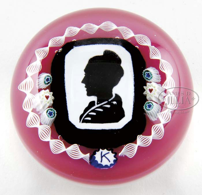 CHARLES KAZIUN SILHOUETTE PAPERWEIGHT. A black and white silhouette of Whistler’s Mother is surrounded by six millefiori canes and a white latticino torsade. Signed with a blue and white “K” signature cane as well as a gold “K” on the reverse side. SIZE: 1-1/2″ t x 2″ dia. PROVENANCE: From the Estate of Bernard Piken; Boston, Mass. CONDITION: Very good to excellent. 5-62384 (500-1,000)