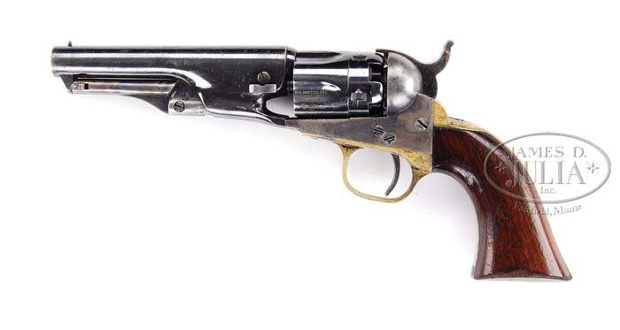 FINE COLT MODEL 1862 POLICE PERCUSSION REVOLVER. SN 30408. Cal. .36. Blue and case color hardened with 4-1/2″ rnd bbl, brass pin front sight and 1-line “NEW-YORK U.S. AMERICA” address. Left side of the frame has a small “COLTS PATENT” and the brass trigger guard and backstrap contain a 1-pc walnut grip that appears to have the last digits of a serial number “516” and the initials “J.E.A.” Cyl is usual fluted 5-shots with last four digits of serial number on the lands between the nipples and all five safety pins crisp. CONDITION: Very fine, all matching except wedge which is un-numbered and grip as noted. Bbl retains 92-94% glossy orig blue with light muzzle wear and light nicks and scratches. Rammer and handle retains most of their lightly faded orig case colors, brilliant on the pivot. Frame retains strong case colors on the sides, faded on the left recoil shield, bright on the right side and brilliant in sheltered areas. Hammer retains strong bright colors on the sides. Cyl retains virtually all of its glossy orig blue. Grip frame retains silver in the most sheltered areas having been cleaned and polished and now retains a medium mustard patina. Grip shows medium wear on the edges with slightly chipped right toe with light nicks and scratches and retains about 85% strong orig varnish. Mechanics are fine, brilliant shiny bore with one or two tiny spots of pitting. 4-39830 JR386 (4,000-7,000)