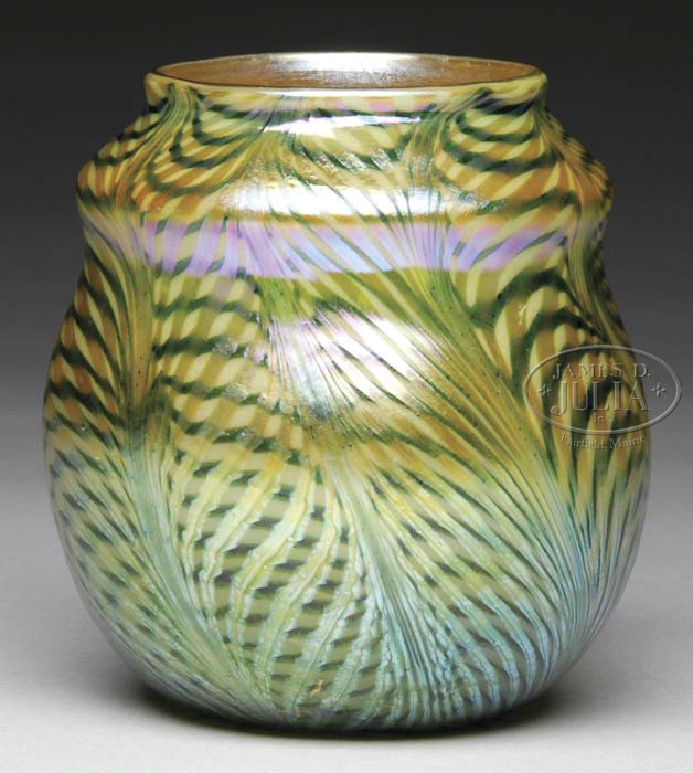 PULLED FEATHER ART GLASS VASE. Vase is decorated with gold and green swirling pulled feather iridescent decoration with an interior gold finish having purple highlights. Signed on underside with spurious “Quezal”. SIZE: 4-1/4″ t. CONDITION: Very good to excellent. 5-60662 (500-700)