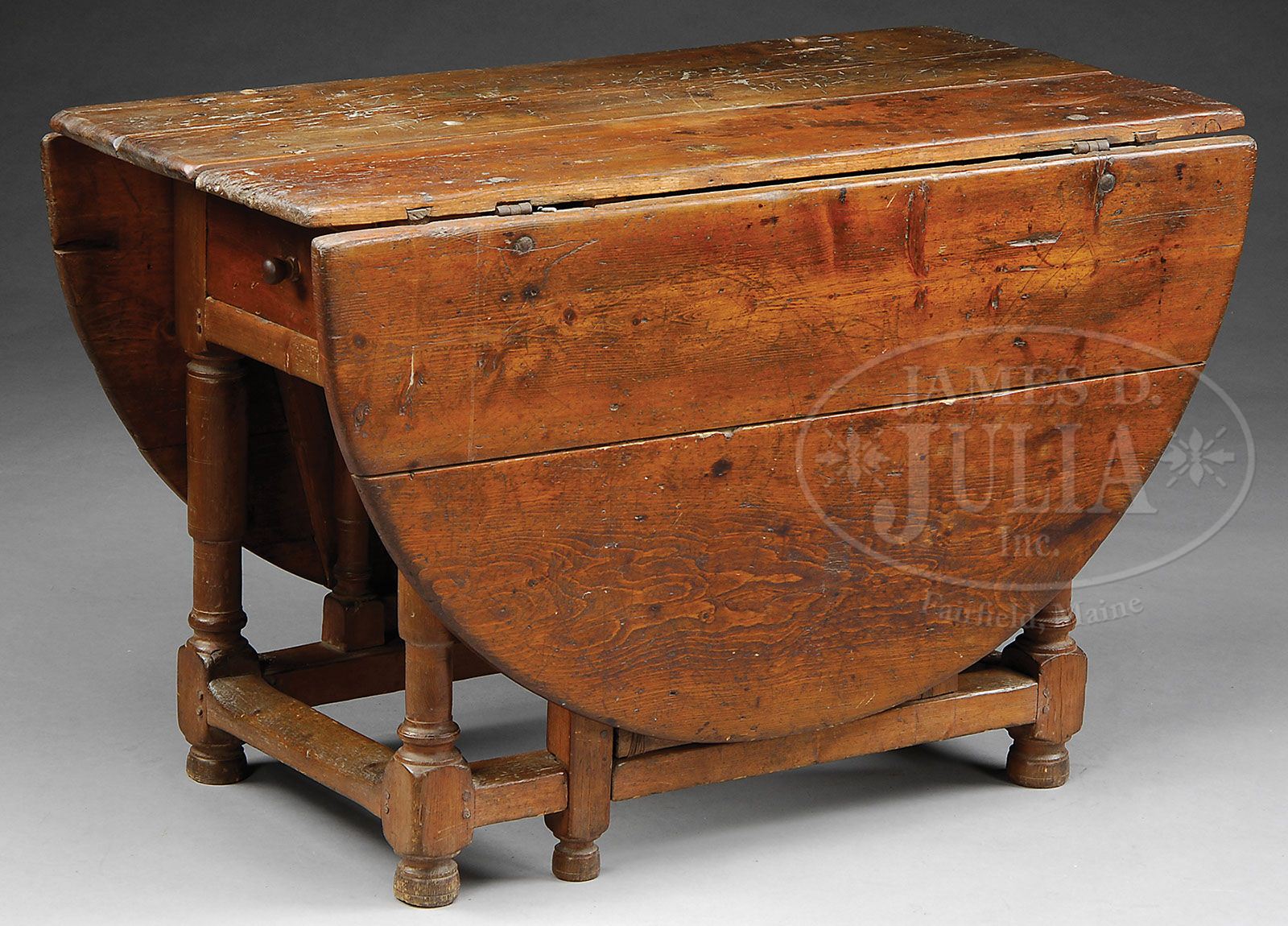 WILLIAM AND MARY PINE GATELEG TABLE. 18th century. The rectangular plank top with hinged demilune leaves projecting above the conforming frieze fitted with a single drawer at the end. Raised on blocked and cannon barrel cylindrical legs joined by an H-form stretcher, each side with conforming gate. SIZE: 27-3/4″ h. Top (closed): 43″ x 22″. Top (open): 43″ x 64″. PROVENANCE: From a fine coastal Westerly, RI estate. CONDITION: With old worn and patinated surfaces and with original hardware and drawer. Underside of planks on top with minimal old insect bores. Generally good. 9-28332 (1,000-2,000)