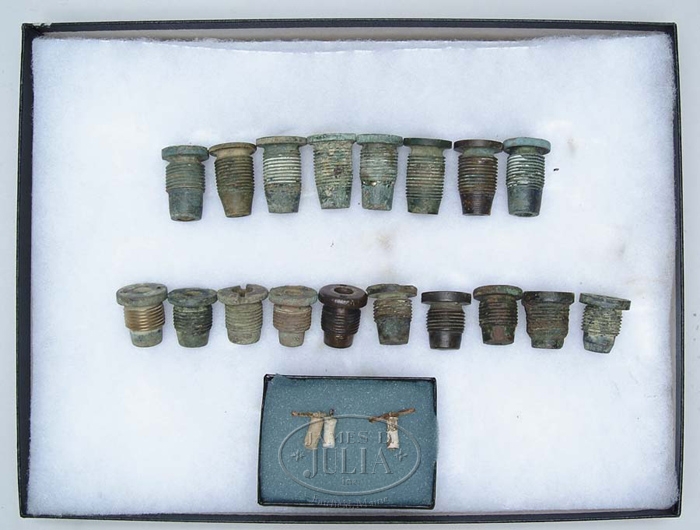 COLLECTION OF 18 CS COPPER TIME FUSES. Excavated. Set includes: eight various rifled artillery projectile time fuses and ten cannonball time fuses (various manufacturers). CONDITION: Good to fine condition. 4-56283-20 JM247 (450-900)