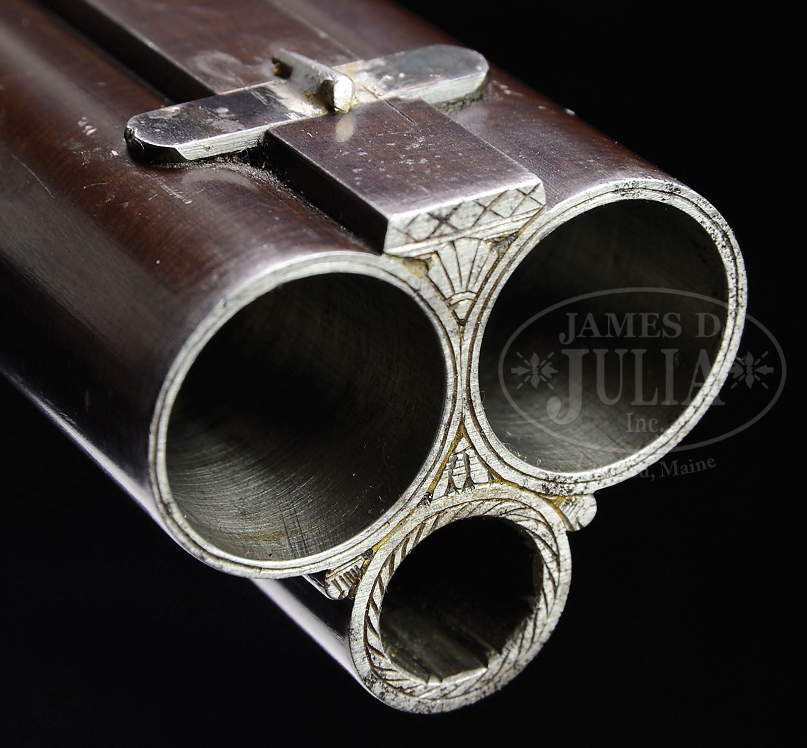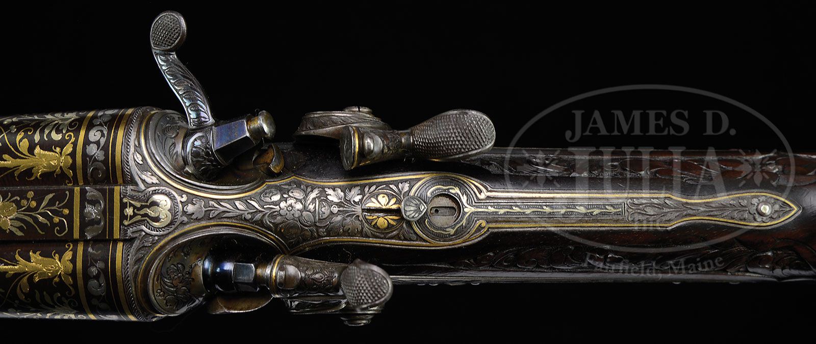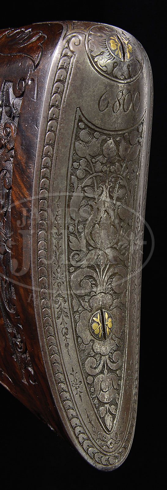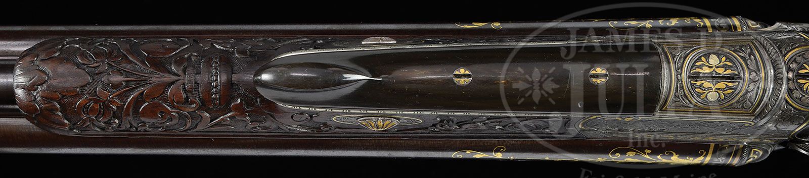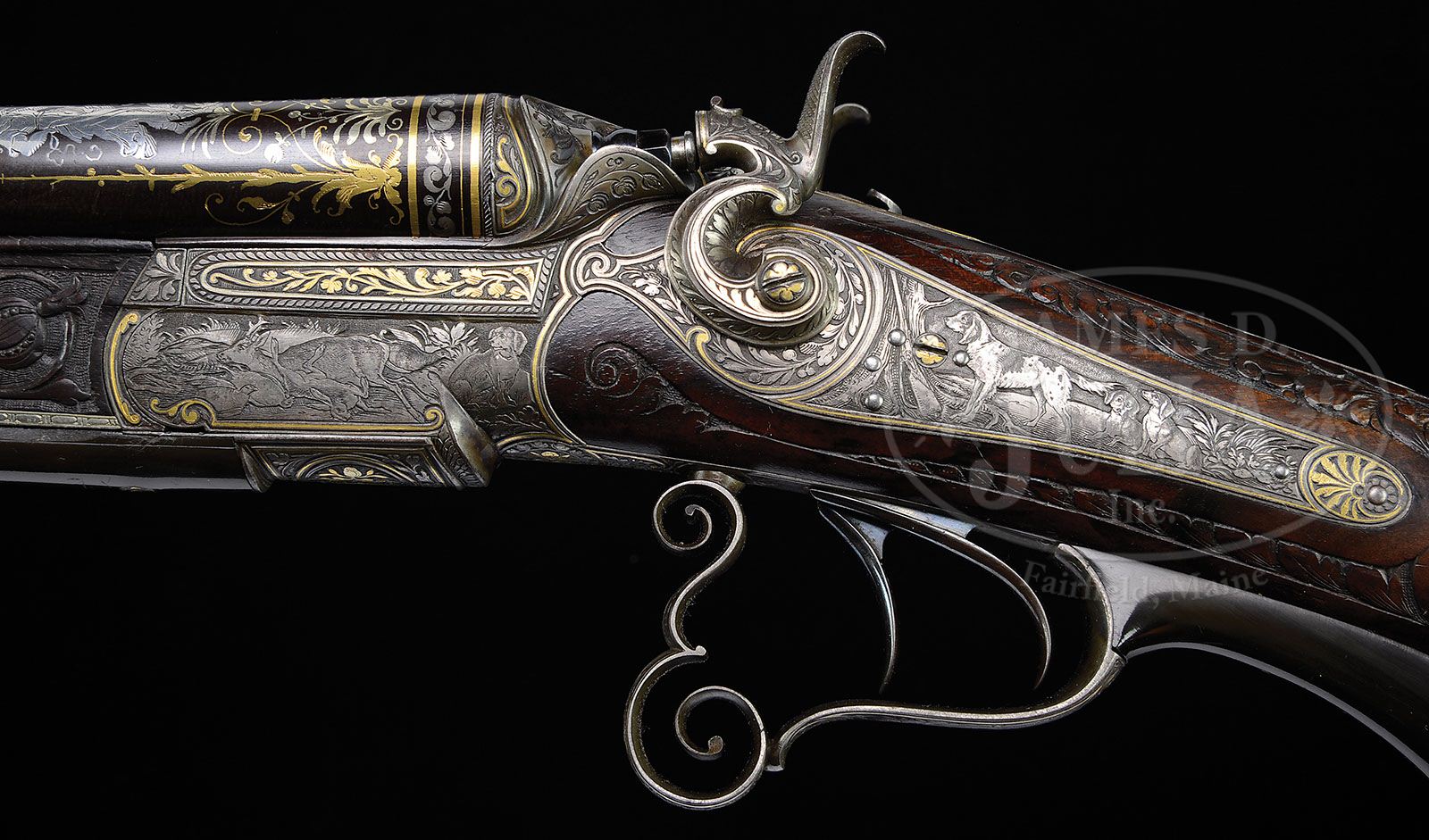 HIGHLY EMBELLISHED C. STIEGELE (MUNCHEN) HAMMER DRILLING OWNED BY JAPANESE EMPEROR, MEIJI. SN 6800. Cal. 16 x 16/10.5 x 47R. 27-3/4″ Damascus bbls are of a pattern resembling Bernard twist. Rifle bbl is steel, rifling is Alexander Henry type. These beautifully browned bbls are inlaid in multi-colored gold and silver depicting flower stalks and acanthus with bowl of fruit scrolled finials surrounding silver inlaid full figures of Diana, Goddess of the Hunt, and her hound on left bbl, facing St. Hubertus and his stag on right. There are gold bands at breech ends either side of inlaid silver acanthus scroll. Flat full length rib with V-notch flip-up rear rifle sight, and silver bead front, is gold inlaid “C. Stiegele jun. Munchen” in a Gothic script, with silver and two color gold open acanthus inlaid scroll at either end; forward end with inlaid silver bird. Bottom bbl is stamped with SN, no proofs are present. Forward pivoting horn underlever action is beautifully filed with scrolled fences, and long heat blued firing pin retainers. Right retainer has pivoting lever rotating out of the way for firing rifle bbl. A flip-up lollypop rear sight is mounted in top strap. Peninsula back action rebounding locks, have high spurred, short, deeply chamfered and intricately filed serpentine hammers. Trigger plate is fitted with double triggers (front set). Double scrolled trigger guard bow has horn grip with carved scroll at rear. Sling loops are mounted on bottom bbl and toe line. Action, locks, and trigger guard are deeply relief engraved with scenes of game (living and dead), dogs, and hunter. Left side action has hound pondering assortment of killed game including deer, rabbit, and birds; left lockplate has setter and hounds in meadow. Right action has roebuck falling while doe escapes, and a fox scampers away in foreground; jubilant hunter waving crossbow is in background. Right lock has stags, hinds, and calf in flight. These well detailed vignettes are framed by gold wire inlay, acanthus engraving, as well as acanthus gold inlay on sides of action and hammer flats. All screw heads are also gold inlaid in floral motif. Trigger guard is engraved with snipe and hares. Beautifully marbled European walnut buttstock with Bavarian style cheekpiece, ends in engraved and gold inlaid steel buttplate with SN at top and royal stag engraved on tang. Stock is intricately carved with well rendered acanthus. right side having nearly full coverage. Central medallion depicts family group of pheasants. Left side of stock behind cheekpiece is carved in large acanthus scroll with stippled background. Chamfer of cheekpiece has date “1886” carved. Acanthus carved, matching forend is fastened to bbl with side nail through engraved and inlaid oval escutcheons, and bbls take down in typical manner. A thick silver wear plate is at bottom of forend. All craftsmanship, engraving, carving and inlay is of the highest order, and fit for an emperor. Bore diameter: left-.662, right -.665. Bore restrictions: left -.012 (light mod), right -.000 (Cyl). Wall thickness: left -.023, right -.025. Drop at heel: 2-5/8″, drop at comb: 1-1/4″. Weight: 8 lbs. 0 oz. LOP: 13-7/8″. PROVENANCE: Der Waffenschmied, Issue no. 41. “A Drilling for the Emperor”, with description and photos. Orig translation of letter from Manjiro Ijetsu relating history of drilling, and how he acquired it, stating “the following gun was made in Germany in 1886 and had been under custody of the Minister of the Imperial household as favorite gun of his majesty, Emperor Meiji. The proprietor of the Okamoto Guns Store located at Okachi – Machi, Tokyo, is most familiar with the said gun because he had gone to the imperial palace to repair it for a long time. Since the termination of the Greater East War (2nd war) the said gun was released from the possession of the Minister of the Imperial household as payment in kind for property tax of the Imperial house. As a result, the said gun had been transferred to the possession of ex-count Ushiji Kabayama at first and then to Mr. Ijetsu, Manjiro. The said Ijetsu, the undersigned, finally transferred the said gun to Capt Robert H. Whan. Gun: formerly owned by the minister of the Imperial household as registration no. 1 calibre – 16 ban. no: 6800. Triple – barrel gun made in Germany.” Also included is certificate of transfer to Capt. Whan, who was Lt. Col. in service dates 1934 – 57, also a photocopy of first letter and orig of certificate of transfer in Japanese; all with envelope to Mrs. R. H. Whan marked “gun papers”. CONDITION: Excellent, showing very little use. Bbls retain 90 – 95% orig Damascus brown with some areas of lightening where flash rust has been cleaned and some silvering on sharp edges and at muzzles. Action and lockplates retain most of their orig muted case hardening color, the balance silver and gray brown. Stocks retain most of their orig finish, grain slightly raised, carving excellent. Triggers, sling loops, and firing pin retainers retain 80% + of their orig fire blue. Bores are excellent, bright and shiny throughout. Action is tight. Locks are crisp. Set trigger works. A spectacular gun. 4-47192 MGM49 (25,000-40,000)
