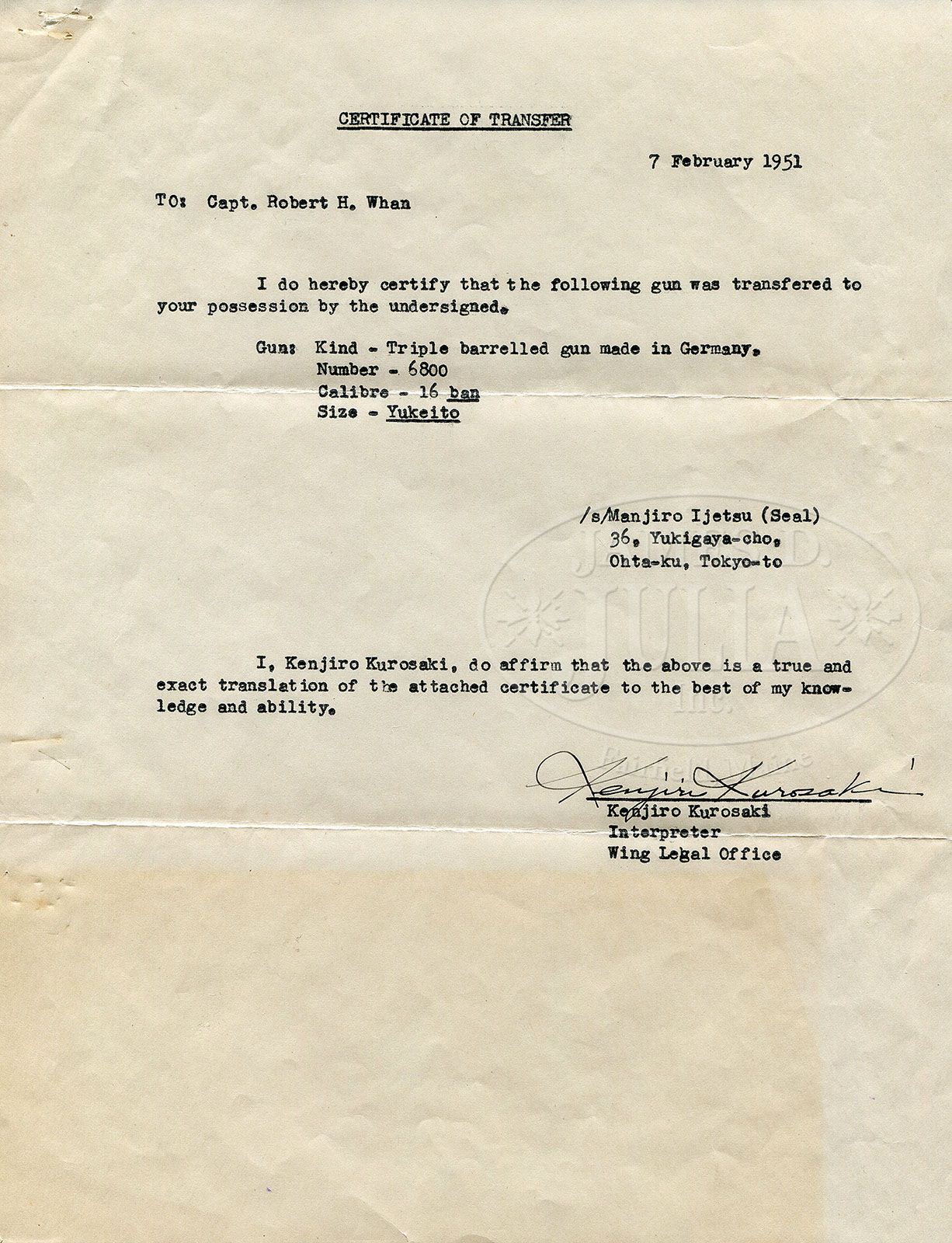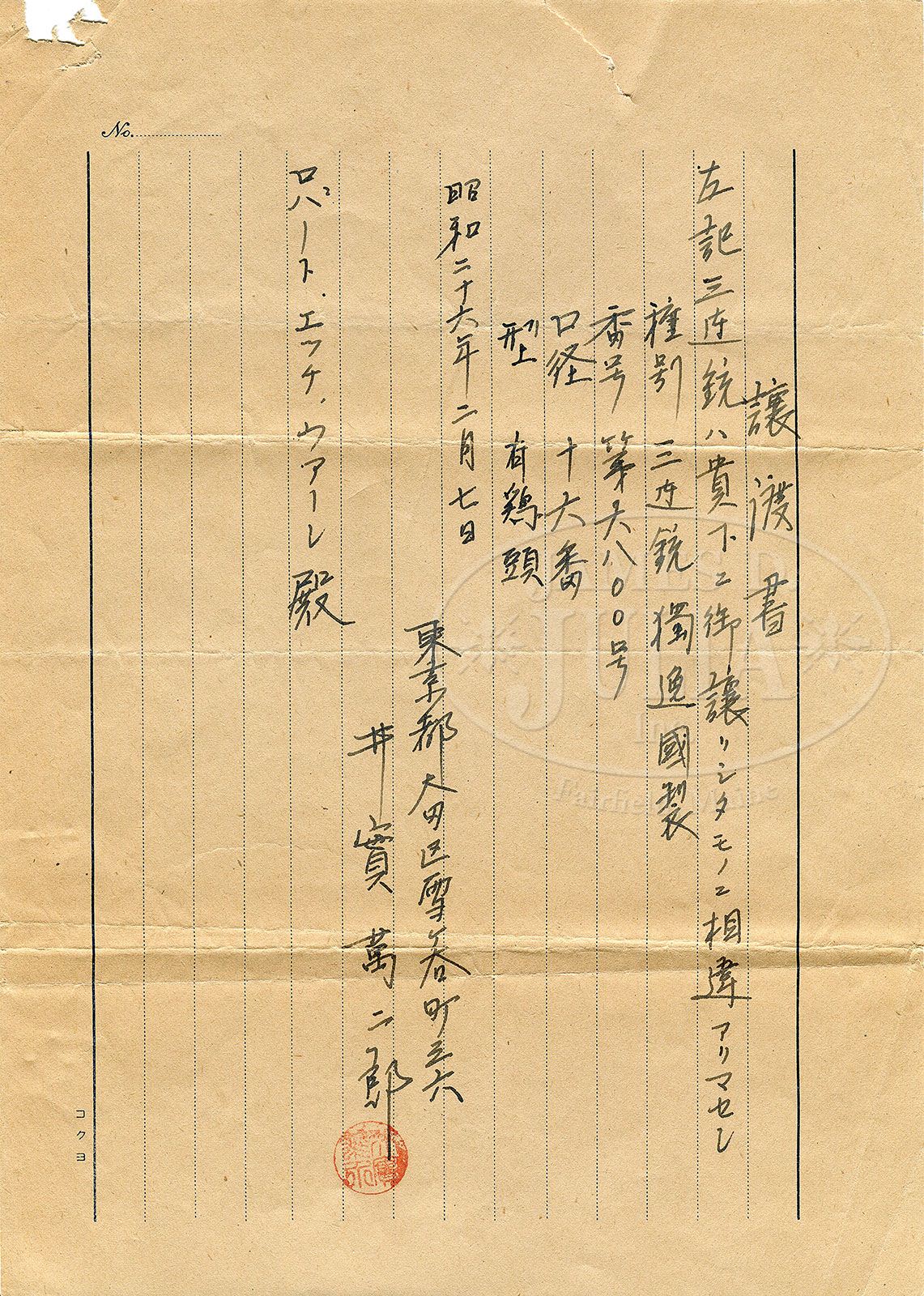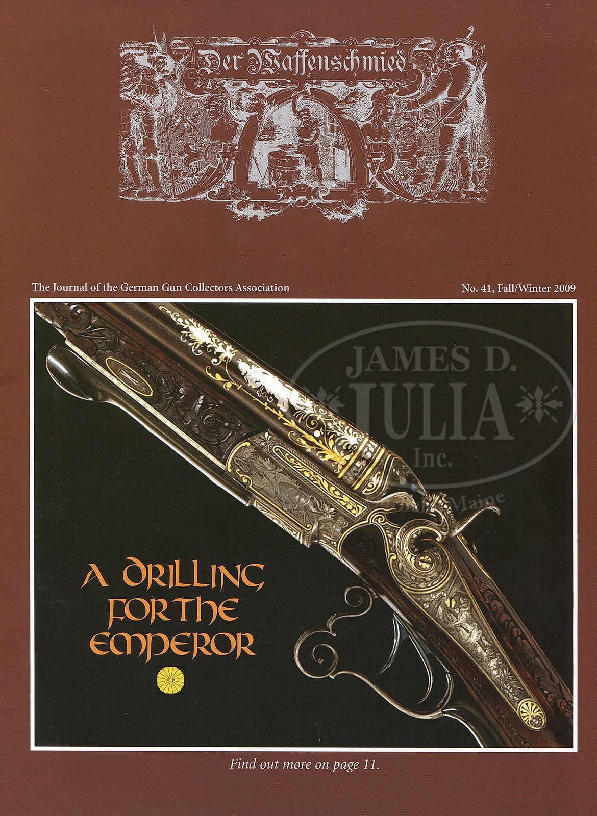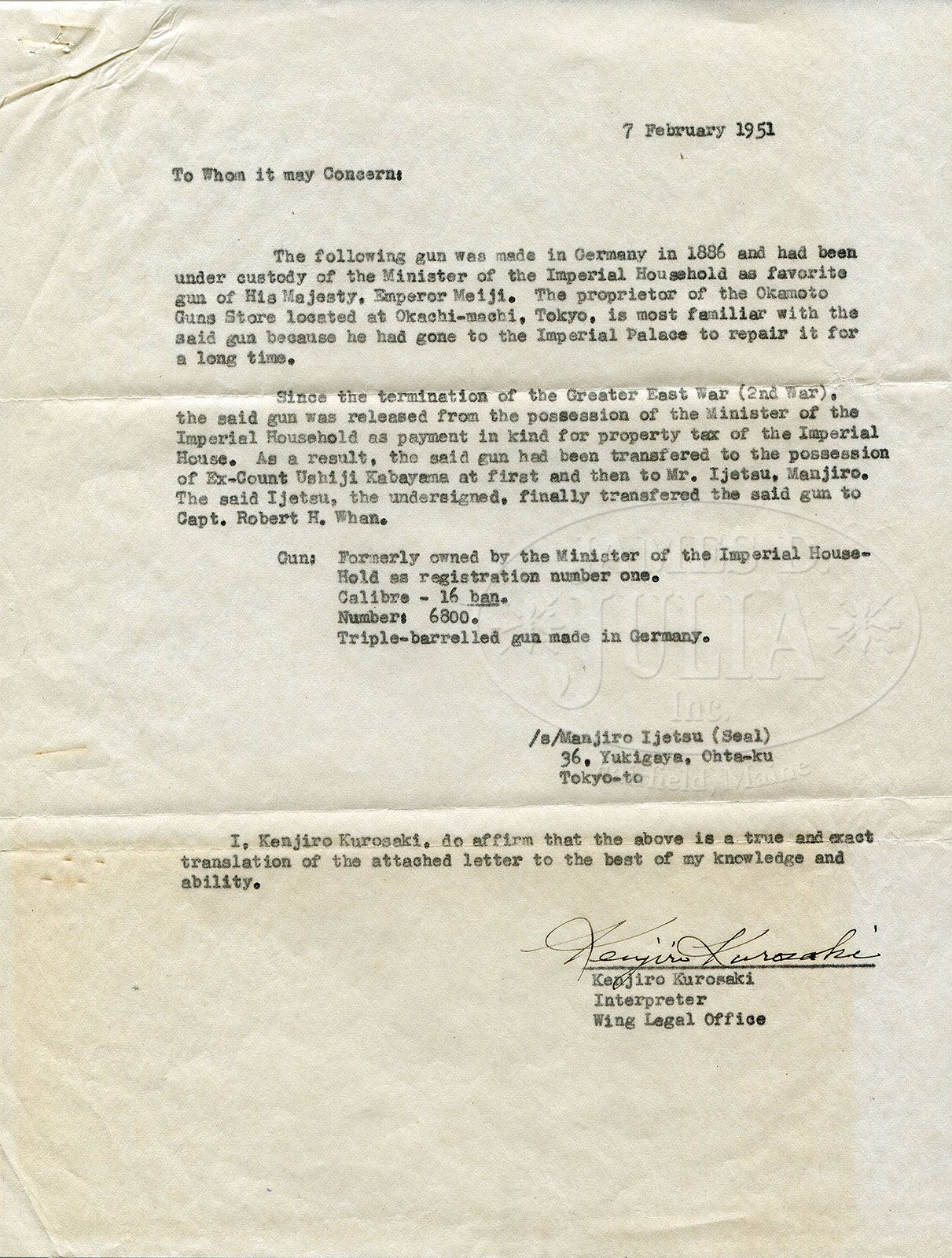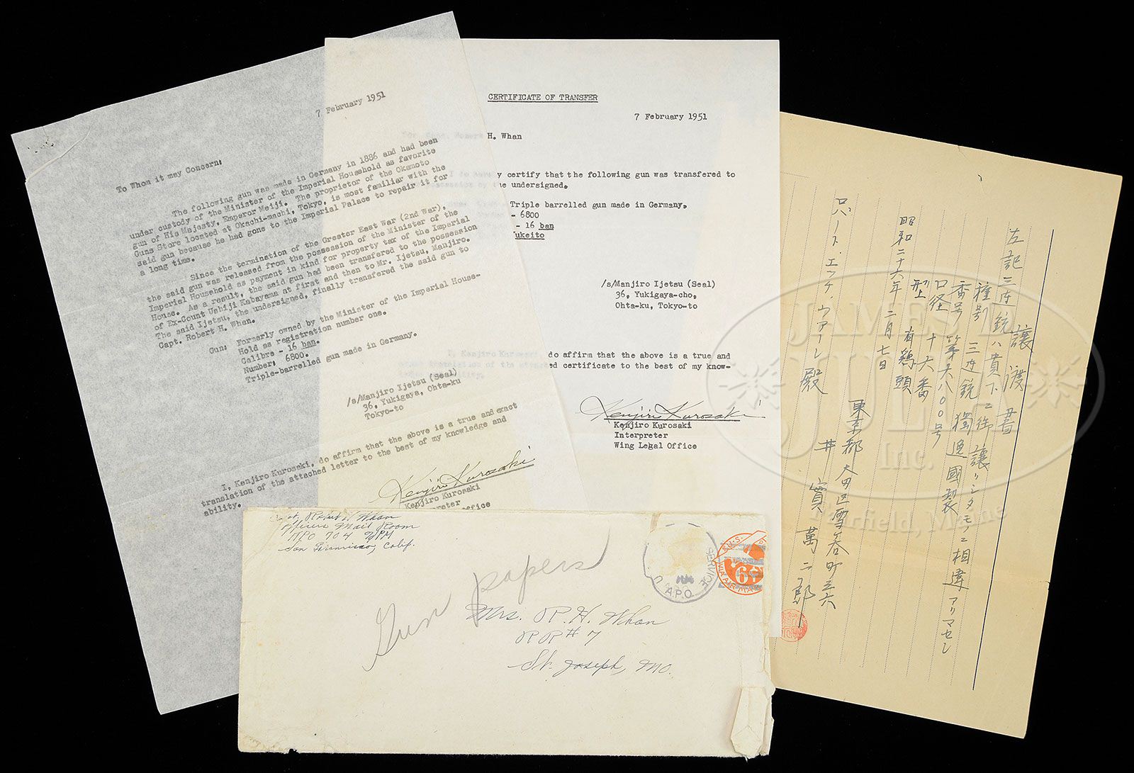 HIGHLY EMBELLISHED C. STIEGELE (MUNCHEN) HAMMER DRILLING OWNED BY JAPANESE EMPEROR, MEIJI. SN 6800. Cal. 16 x 16/10.5 x 47R. 27-3/4″ Damascus bbls are of a pattern resembling Bernard twist. Rifle bbl is steel, rifling is Alexander Henry type. These beautifully browned bbls are inlaid in multi-colored gold and silver depicting flower stalks and acanthus with bowl of fruit scrolled finials surrounding silver inlaid full figures of Diana, Goddess of the Hunt, and her hound on left bbl, facing St. Hubertus and his stag on right. There are gold bands at breech ends either side of inlaid silver acanthus scroll. Flat full length rib with V-notch flip-up rear rifle sight, and silver bead front, is gold inlaid “C. Stiegele jun. Munchen” in a Gothic script, with silver and two color gold open acanthus inlaid scroll at either end; forward end with inlaid silver bird. Bottom bbl is stamped with SN, no proofs are present. Forward pivoting horn underlever action is beautifully filed with scrolled fences, and long heat blued firing pin retainers. Right retainer has pivoting lever rotating out of the way for firing rifle bbl. A flip-up lollypop rear sight is mounted in top strap. Peninsula back action rebounding locks, have high spurred, short, deeply chamfered and intricately filed serpentine hammers. Trigger plate is fitted with double triggers (front set). Double scrolled trigger guard bow has horn grip with carved scroll at rear. Sling loops are mounted on bottom bbl and toe line. Action, locks, and trigger guard are deeply relief engraved with scenes of game (living and dead), dogs, and hunter. Left side action has hound pondering assortment of killed game including deer, rabbit, and birds; left lockplate has setter and hounds in meadow. Right action has roebuck falling while doe escapes, and a fox scampers away in foreground; jubilant hunter waving crossbow is in background. Right lock has stags, hinds, and calf in flight. These well detailed vignettes are framed by gold wire inlay, acanthus engraving, as well as acanthus gold inlay on sides of action and hammer flats. All screw heads are also gold inlaid in floral motif. Trigger guard is engraved with snipe and hares. Beautifully marbled European walnut buttstock with Bavarian style cheekpiece, ends in engraved and gold inlaid steel buttplate with SN at top and royal stag engraved on tang. Stock is intricately carved with well rendered acanthus. right side having nearly full coverage. Central medallion depicts family group of pheasants. Left side of stock behind cheekpiece is carved in large acanthus scroll with stippled background. Chamfer of cheekpiece has date “1886” carved. Acanthus carved, matching forend is fastened to bbl with side nail through engraved and inlaid oval escutcheons, and bbls take down in typical manner. A thick silver wear plate is at bottom of forend. All craftsmanship, engraving, carving and inlay is of the highest order, and fit for an emperor. Bore diameter: left-.662, right -.665. Bore restrictions: left -.012 (light mod), right -.000 (Cyl). Wall thickness: left -.023, right -.025. Drop at heel: 2-5/8″, drop at comb: 1-1/4″. Weight: 8 lbs. 0 oz. LOP: 13-7/8″. PROVENANCE: Der Waffenschmied, Issue no. 41. “A Drilling for the Emperor”, with description and photos. Orig translation of letter from Manjiro Ijetsu relating history of drilling, and how he acquired it, stating “the following gun was made in Germany in 1886 and had been under custody of the Minister of the Imperial household as favorite gun of his majesty, Emperor Meiji. The proprietor of the Okamoto Guns Store located at Okachi – Machi, Tokyo, is most familiar with the said gun because he had gone to the imperial palace to repair it for a long time. Since the termination of the Greater East War (2nd war) the said gun was released from the possession of the Minister of the Imperial household as payment in kind for property tax of the Imperial house. As a result, the said gun had been transferred to the possession of ex-count Ushiji Kabayama at first and then to Mr. Ijetsu, Manjiro. The said Ijetsu, the undersigned, finally transferred the said gun to Capt Robert H. Whan. Gun: formerly owned by the minister of the Imperial household as registration no. 1 calibre – 16 ban. no: 6800. Triple – barrel gun made in Germany.” Also included is certificate of transfer to Capt. Whan, who was Lt. Col. in service dates 1934 – 57, also a photocopy of first letter and orig of certificate of transfer in Japanese; all with envelope to Mrs. R. H. Whan marked “gun papers”. CONDITION: Excellent, showing very little use. Bbls retain 90 – 95% orig Damascus brown with some areas of lightening where flash rust has been cleaned and some silvering on sharp edges and at muzzles. Action and lockplates retain most of their orig muted case hardening color, the balance silver and gray brown. Stocks retain most of their orig finish, grain slightly raised, carving excellent. Triggers, sling loops, and firing pin retainers retain 80% + of their orig fire blue. Bores are excellent, bright and shiny throughout. Action is tight. Locks are crisp. Set trigger works. A spectacular gun. 4-47192 MGM49 (25,000-40,000)
