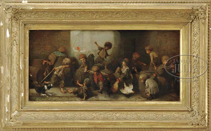 ALBERT LUDOVICI (British, 1820-1894) LONDON STREET URCHINS. Oil on board scene shows thirteen young children playing amongst storage kegs with a dog and two chickens. A man is seen with red cap and stick coming toward the kids through an opening in the wall. Signed with artist monogram and dated “1861” lower right. Housed in an antique gesso decorated frame. SIZE: 7-1/4″ x 14-3/4″. CONDITION: Very good, craquelure. 9-23047 (3,000-5,000)