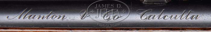 *RARE & DESIRABLE WINCHESTER 1895 LEVER ACTION RIFLE. SN 58466. Cal. 405 WCF. 24″ rnd bbl, pedestal front with Lyman fine bead sight & Winchester 2-Leaf Express rear. Bbl is factory inscribed “MANTON & CO. CALCUTTA”. Inscribed Model 95’s are extremely rare. Mounted with straight grain American walnut, uncheckered straight grip & crescent butt. Installed with sling eye-loop & matching loop in place of forend screw. Schnable forend with ebony insert tip. Accompanied by Cody Firearms Museum letter identifying gun as 40 caliber rifle, Lyman front, Winchester Express rear, shotgun butt, “Martin & Company, Calcutta”; received in warehouse May 24, 1907, & shipped from warehouse June 1, 1907, on order no. 95513. Also accompanying is photocopy of factory ledger with guns numbered 58450 – 58469 and showing Manton Co. CONDITION: Fine. Bbl retains 95-98% orig blue with muzzle wear & a couple of small spots of thinning blue. Receiver has 20-30% orig blue blended with a gray/brown/silver patina, some from flaking & some from wear. Stock is sound, with tiny hairline behind top tang & tiny sliver missing upper left side of tang; has some usual nicks & dings & a few bruises on right side with 70% orig finish & hand-worn patina through grip area. Butt plate has turned a soft gray patina. Forend has numerous nicks & dings but is sound & carries a hand-worn patina finish. Mechanics are crisp with shiny bore & slight bulge not quite 1″ from muzzle. 4-35387 (3,500-5,500)
