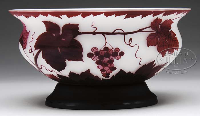 LOETZ CAMEO BOWL. Large pedestal bowl has a white background and is cameo cut back in a design of grapevines including grapes and leaves. The bowl is finished with a white interior. Signed “Loetz in cameo to underside of bowl. SIZE: 5″ t x 9-1/4” dia. PROVENANCE: From the Private Collection of Dorothy Lee Jones. CONDITION: Very good to excellent. 5-61716 (700-1,000)