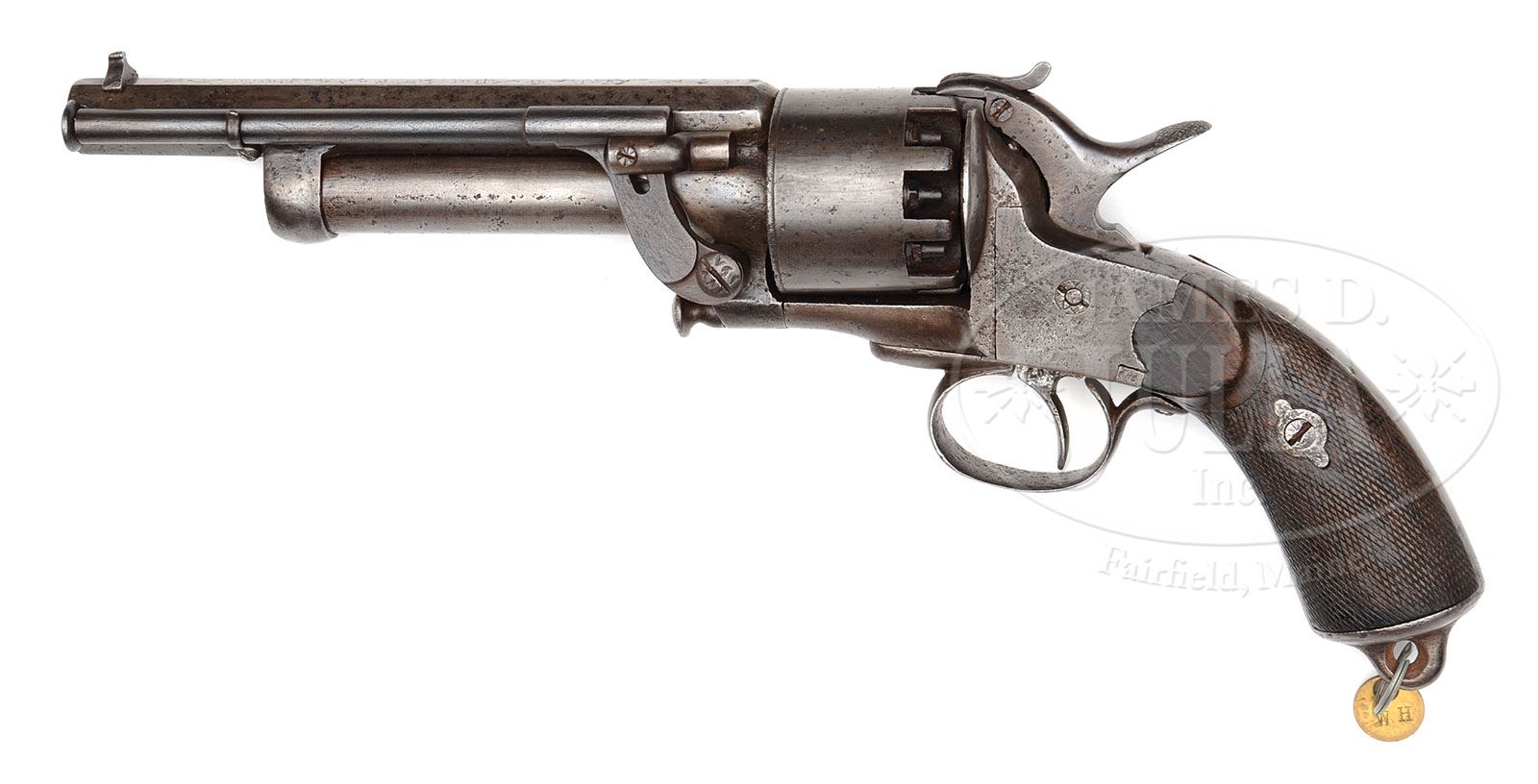 CONFEDERATE 2ND MODEL LEMAT PERCUSSION REVOLVER. SN 1585. Cal 42/18 ga. This is an orig example of the standard production LeMat grape-shot revolver. Standard production guns, often called 2nd Models, feature improvements made by LeMat that worked the best, including Colt style ratchet system to turn cyl. The revolver has the distinctive LeMat 9-shot cyl. 42 caliber rifled bbl with smooth bore ‘grape-shot’ 18 ga bbl for firing buckshot. The top bbl flat is marked “Col. LeMat Bte s.g.d.g. Paris” which is the standard addressing on LeMat standard production guns. PROVENANCE: William Hoffeld collection. CONDITION: Gun overall is gray, cleaned and pitted. Bbl address and SNs are all discernible, as can be seen in photos. Loading assembly is unserialized and appears to be an excellent restoration with similar color and patina to balance of gun. Left stock has large central crack repair. Mechanically gun functions well. 4-48636 JS3 (8,000-12,000)