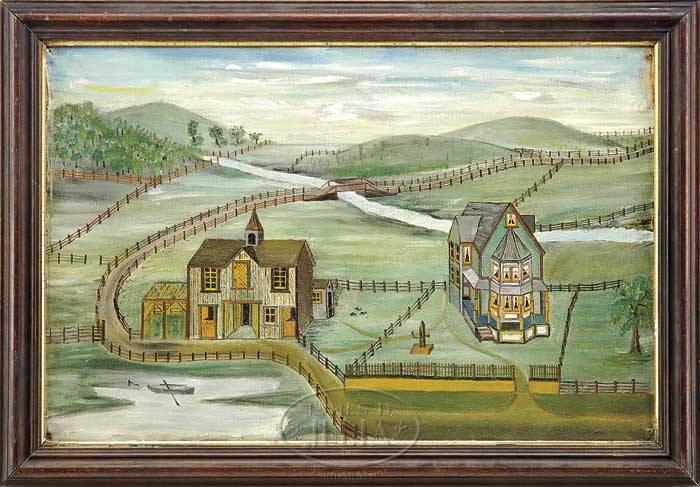 FOLK ART PAINTING OF A PENNSYLVANIA FARM. The wonderful oil on canvas scene shows the farm of a well-to-do owner. A three story house with wraparound porch having a manicured lawn with two story barn, with attached horse stall. The expansive fields segregated fencing and a farm pond having a small rowboat. A river comes from two hills and flows under bridge past house. Unsigned and housed in its original black walnut and gilt edge Victorian frame. SIZE: 19-3/4″ x 30-3/4″. CONDITION: Very good. 9-99604 (3,000-5,000)