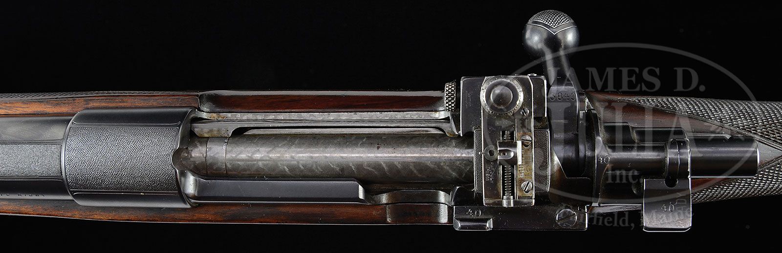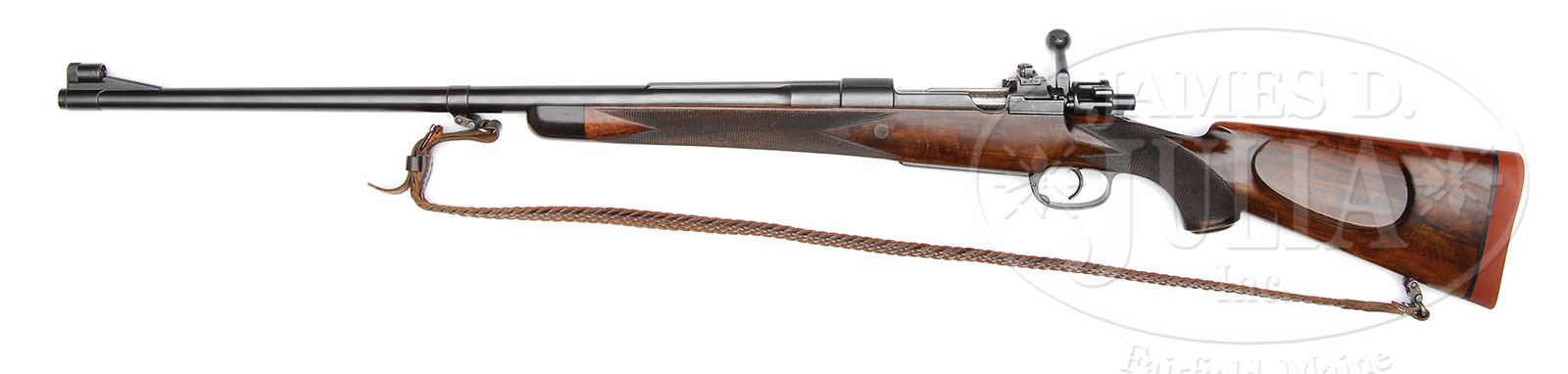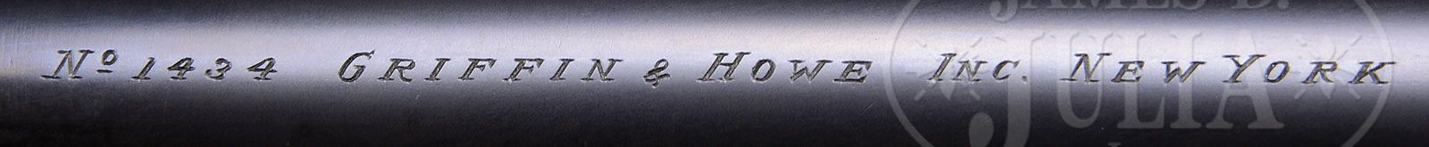 *GRIFFIN & HOWE MAGNUM MAUSER DANGEROUS GAME RIFLE. SN 1434. Cal. .416 Rigby. Mauser no. 93840. 26″ Tapered, round bbl with integral matted quarter rib, has banded-on sling eye and ramped front sight base having longitudinally dovetailed white bead, and knurled slide-on cover. Top of bbl is engraved “No 1434 Griffin & Howe Inc New York”. Left rear of bbl is engraved with caliber. Magnum Mauser square bridge action is mounted with Lyman 48 receiver sight, portion of bridge filed to accept sight staff. Bolt with two panel checkered pear-shaped knob damascened on body and extractor, is fitted with long cocking piece and flag safety, which is silver inlaid “SAFE” and “READY”, orig two stage trigger, has blade checkered. Orig drop box bottom metal specially made for the 416 Rigby cartridge, has hinged floorplate with button release at front of trigger guard bow. Follower is engine turned. Mauser SN is stamped behind recoil lug on bottom of action and at rear of magazine. (Rifle disassembled to see) Bolt is stamped with last 4 digits, all other parts with last 2 digits (40). Dense, broadly streaked, and lightly figured French walnut, full steel capped pistol grip stock measures 14″ over Silvers type pad. Checkering at grip and forend is in classic point pattern with mullered borders; forend checkering wrapping completely around stock. Stock also features classic G & H style beaded cheekpiece, horn forend tip, engraved recoil bolt, and with slightly fluted transitions from grip to body of stock around action. A round swivel stud and gold oval engraved “JEP” are on toe line. Also a woven leather sling in Supergrade type swivels. Drop at heel: approx 2-5/8″, drop at comb: approx 1-5/8″. Weight: 9 lbs. 14 oz. LOP: 14″. PROVENANCE: Factory letter giving history of rifle, as evidenced by copies of inventory book pages, and stating that it was received into A & F inventory in 1938 with specifications, and was most recently part of collection of Joseph E. Prather, former president and CEO of Griffin & Howe Inc. CONDITION: Excellent. Metal parts retain nearly all of what appears to be their orig satin blue. Stock retains nearly all of its orig oil finish augmented with oil to a gloss. G&H gunsmith reveals bbl channel modified with added wood fillet as part of original mfg. Checkering is slightly worn and dark. Toe of stock is professionally repaired. Bore is excellent with sharp rifling throughout. Pad is a proper replacement. Sling is fine. A scarce and desirable American classic (Michael Petrov has 7 in his G & H database) in one of the most highly regarded general purpose African calibers of all time. 4-47530 MGM86 (12,500-17,500)