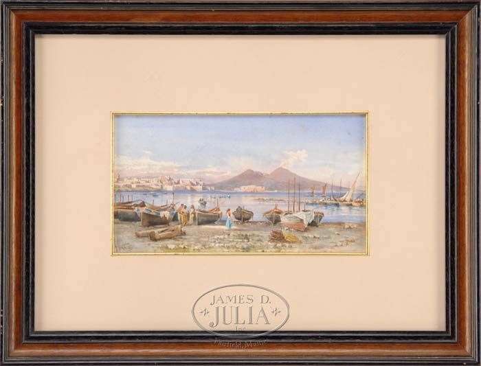 G. GIUTTI (Italian, 19th Century) NAPLES HARBOR. Fine watercolor scene shows several fishing boats on dry beach with Naples in the background and volcano spewing smoke. Signed lower left. Housed in a black and walnut stained wood molded frame with wide matte having a gilt liner. SIGHT SIZE: 6” x 11”. CONDITION: Good. 9-74959 SM (800-1,200)