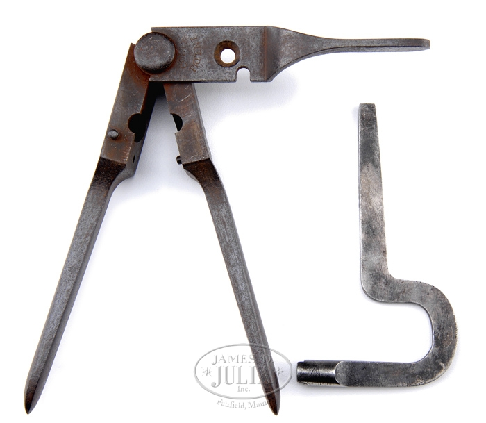 LOT CONSISTING OF WALKER BULLET MOLD AND NIPPLE WRENCH. Iron bullet mold, approx5-1/4″ long, with single cavity for .44 cal conical bullet. Sprue cutter is marked on top “COLTS PATENT “. Lot includes the U shaped nipple wrench and screw driver for the Colt Walker revolver. CONDITION: Bullet mold has overall light pitting and some surface rust. Cavity itself is heavily rusted and pitted. Wrench is in very good to excellent condition retaining some of the orig blue finish. 4-32415 DM74 (3,000-5,000)