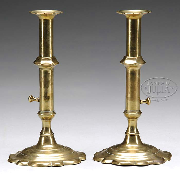 PAIR OF QUEEN ANNE BRASS PETAL BASE CANDLESTICKS. Second quarter 18th century, England. Each example with side ejector, petal form bobeche, columnar standard and stepped petal base. SIZE: 8″ h. CONDITION: Very good overall. No restoration or damages noted with minor and minimal denting on base rim. 9-98173 (700-1,000)