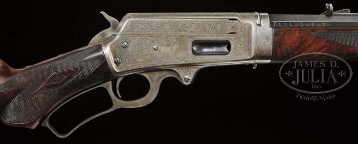 RARE SPECIAL ORDER DELUXE ENGRAVED MARLIN MODEL 1895 TAKEDOWN LEVER ACTION RIFLE. SN 140983. Cal. 38-56. Beautiful ’95 Marlin with 26″ oct to rnd bbl, full magazine, German silver Rocky Mountain front sight and Marlin semi-buckhorn rear sight. Mounted with very highly figured flame grain American walnut, “F” style checkered with serpentine pistol grip and crescent steel buttplate. Receiver is engraved by Conrad Ulrich in Style 3 with the oval vignette of a standing bull moose in a forest scene on left side and a standing whitetail buck oval vignette on right side. Surrounding both vignettes, top & bottom of receiver, top tang, takedown ring, buttplate tang and exposed flats of bbl over chamber area are all engraved in wonderful foliate arabesque patterns with punch dot background. Sides of receiver have various border patterns. Left side of the upper tang, under the wood, is stamped with matching SN which number is also inside toe of buttplate. Buttstock has a repaired crack in the wrist and it appears that the stock number was obliterated during the repair. Accompanied by a copy of a Cody Firearms Museum letter on Marlin letterhead which identifies this rifle in cal. 38-56 with 26″ half oct bbl, half magazine, pistol grip & takedown, shipped Sept. 14, 1896. According to Flayderman’s Guide to Antique American Firearms only about 18,000 of these scarce rifles were produced in the period 1895-1917 in seven different calibers, both standard & deluxe, with various configurations and checkering patterns. Only a few had special order features as found here and very few of those were engraved. CONDITION: Very fine. Bbl & magazine tube retain about 95-96% orig blue with muzzle end & sharp edge wear and some light thinning on magazine tube; receiver retains faded case colors in sheltered areas having mostly faded to silver over most of the surfaces; lever & hammer also retain faded case colors on sides, turned silver on outer faces; buttplate appears to be nickel finish but may be simply very bright silvered case colors; stock, with its repaired wrist, which is difficult to detect, is otherwise sound with light nicks & scratches and retains most of its strong, orig, piano varnish finish with touch-up finish in the checkering on right side of wrist over the repaired area; forearm retains about 80% strong orig piano varnish finish showing wear on bottom rear at carry point and with heavy wear on checkering in same area. Mechanics are fine, very bright shiny bore. Altogether a very beautiful big frame Marlin rifle. 4-45042 JR500 (12,500-17,500)