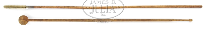 CARBINE CLEANING RODS. Two wood carbine cleaning rods. The first is intended for Civil War and later carbines. It measures approx 5/16″ diameter by 30″ long and has a threaded brass ferrule with a fiber bore brush approx 3/4″ in diameter. The second is an 1874 barracks cleaning rod for carbines, measures approx 5/16″ diameter by 29-3/4″ long with a wooden ball at the upper end measuring approx 1-5/8″ diameter. CONDITION: Both are in excellent condition and complete with only minor soiling and age spots. 4-32574 DM101 (150-400)