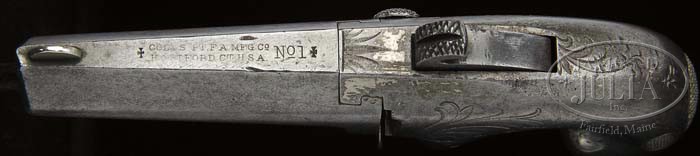 CASED PAIR OF COLT NO. 1 DERRINGERS. SN 1820 & 3106. Cal. 41 RF. Identical derringers with 2-1/2″ ovoid shaped bbls, German silver half moon front sights with usual 2-line bbl addresses. They have all metal frames with curved rnd grips engraved on sides of frame with light foliate arabesque patterns and three checkered panels on grips. There is matching engraving in back of hammer slot. #1820 has fine checkering in the panels on the grip while #3106 has coarse checkering. #1820 has a fine checkered bbl release button while #3106 has a coarse checkered release button. #3106 has the caliber marking below the release buttons while #1820 does not have a caliber marking. Accompanied by a beautiful burl walnut casing with a brass Mexican eagle medallion in the lid and a mortised brass lock in the front edge that has an ivory shield shaped escutcheon. Interior is burgundy velvet lined and French fitted in bottom for the two derringers. Inside the bottom is a fine beveled dust rail. Although such a cased set has not previously been encountered by this cataloger, the casing has the appearance of being authentic. PROVENANCE: Fred B. McDonald Estate Collection. CONDITION: #1820: Very good to fine, all matching. No orig finish remains on bbl, being a cleaned gray metal patina. Frame retains 30-40% orig nickel finish with the balance a cleaned metal patina. The bbl lug that fits into the groove in the frame has been “tightened” making it very difficult to open & close. Mechanics are fine, strong bore with heavy pitting. #3106: Fine, all matching. Overall retains about 30% orig nickel, mostly on left side of frame with bbl & right side of frame cleaned to bright metal. Mechanics are fine, bright shiny bore with a couple of small spots of pitting. Case is extremely fine. 4-41382 JR161 (4,000-7,000)