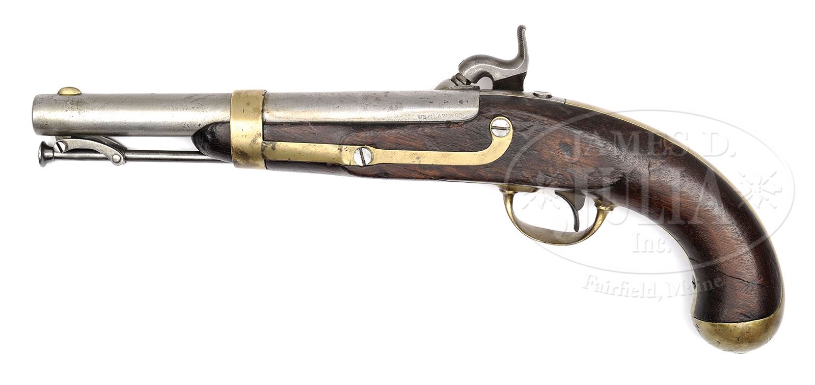 Note description state “original brown finish on bottom of barrel” but there is no brown finish on the barrel. CONFEDERATE PALMETTO ARMORY PISTOL. This is a nice orig Palmetto Armory Model 1842 single shot pistol of which only 1000 were made. Markings are crisp and sharp. Gun is 100% orig and authentic and still retains orig brown finish on bottom of bbl. PROVENANCE: Dr. Andrew Kelley Collection. CONDITION: Bbl, lock and iron are gray/white and cleaned with scattered pitting. Lock markings of “Palm Tree” surrounded by “Palmetto Armory, S.C.” are mostly discernible and “Columbia, S.C. 1852” are crisp and well struck, as are “V/Palm Tree” and “Wm. Glaze”. “1853” on bbl tang and “P” bbl proof are only partially discernible but present. Brass bbl band has brazed repair where it meets escutcheon extension. Brass overall has numerous small dings, dents and scratches and has been cleaned like iron. Stock is broken through under lock and near butt and also has a small inset wood repair between trigger guard and rear of lock about 1″ to 1/2″; otherwise stock has good rich red color and is sound. 4-48890 JS19 (3,000-4,000)