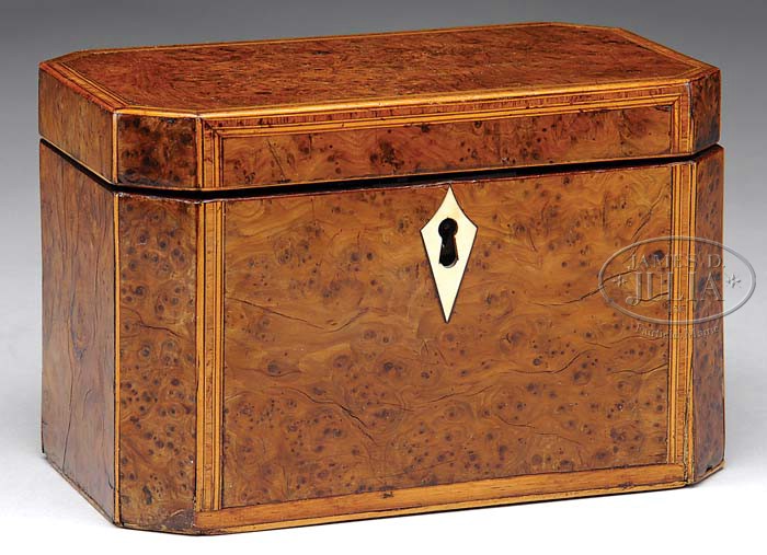 REGENCY YEW AND BURR ELM TEA CADDY. First quarter 19th century. The rectangular case with canted corners, crossbanded with string inlays and ivory escutcheon. The interior with two lidded tea compartments. SIZE: 5″ h x 7-1/4″ w x 4-1/4″ d. CONDITION: Repolished and restored. 9-98064 (500-800)
