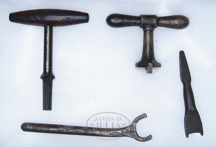 LOT OF FOUR NON-EXCAVATED ARTILLERY TOOLS. 1) fuse reamer having a wooden handle, iron body ; 2) a Navy water cap fuse wrench; 3) an iron fuse wrench; 4) a bronze Bormann fuse wrench with some traces of orig paint. CONDITION: All tools in very fine condition. 4-56291 JM213 (1,500-3,000)
