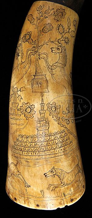 FABULOUS GROUP OF THIRTEEN 18TH CENTURY ENGRAVED POWDER HORNS BY ONE ARTIST. This group of horns represents 13 of the 27 known powder horns carved by same artist known as the “Folky Artist”. There are different schools of carving known on French and Indian War era horns and Revolutionary War era horns which is the period these horns date. This period between 1750 and 1790 was a time when every American military man carried a powder horn with his rifle. This is also the era of the greatest carvers of powder horns, few of which are known by name as they rarely signed their horns, but most are just known by their distinctive styles. There are groups of horns carved by the “Pointed Tree” carver, the “Memento Mori” carver and the subject carver the “Folky Artist”. These artists typically were paid by powder horn owner to be decorated and often named such that one man’s distinctive horn could not be mistook for another. Artistry skills and styles vary greatly among these 18th Century pieces of art. The Folky Artist is thought possibly to be a southern artist as southern characteristics such as palmetto trees, long leaf pine sprouts, scenes of dogs running deer, manatees, an alligator and what appears to be a Spanish mission are among the subjects engraved on his horns. There also appears on one horn to be the Hessian symbol of a double headed eagle. The only Hessian settlement in the south was at that time the Salzburger colony on Saint Simons Island just off the coast of Savannah, Georgia. Of these 13 powder horns collected; 3 had southern provenance. One horn known by this artist is identified to Aaron Lott of Charlestown, South Carolina and is dated 1777. There are recurring themes on many of this unknown artist’s horns. The most unusual of these is a hunter with bag, horn and flintlock rifle. He is dressed in Colonial attire; knee britches, frock coat, complete with tri-corn hat. Many times he is with his dogs running an almost comical bug-eyed deer. At least twice he is found portraying “Adam” with his hat in one hand and accepting an apple from an 18th Century clad “Eve” in the other. Often circle designs are found with two or three smaller spheres inside with “sun, moon and stars” or other personified faces carved within them. Another unique feature of this carver is a moth-like bug and/or a floral type vine with a bloom resembling a thistle blossom. Other recurring devices are found as can be seen in photographs. Mel Hankla who originally put this collection together and studied most of the other known “Folky Artist” horns in various institutional collections, states in his pamphlet produced on the “Folky Artist” the reason there are northern and southern scenes with dates ranging from 1759 to 1777. “My personal opinion, at this particular time, is that Folky Artist was on campaign. He was a soldier that was quite probably as far north as the Canadian border…but I also think he was at least as far south as Savannah, Georgia. Almost all of these powder horns have been engraved with an empty cartouche. Thus…I do not think that he was taking orders or making horns for particular individuals. Several have owner’s initials or a date scratched in, but most all seem to be from a different hand than that of the maker. I feel he was producing these horns for money or for trade. Perhaps he was producing these horns for someone that was actually dealing and selling these horns as a middleman; a merchant or a “drummer” as they would have been called in the day. Although his work is not what we would usually consider as professional, I think he was somewhat of a professional Horner. I believe he was influenced by what was around him; where he was, the people, where they were from and the norm of the accoutrements that they used. From looking at the whole spectrum of horns made by Folky Artist during the French and Indian War to his horns made well into the American Revolution, my personal opinion is that most were made in the field under a vast range of conditions producing much variety in the quality of workmanship. I feel some were produced under very good conditions and thus were very well wrought. And at the other end of the scale, one horn looks like it was perhaps an early attempt or maybe one of his last while laying on his deathbed!” The horns in this collection have each been assigned a name and individual details are available for each. This is a wonderful and probably the largest grouping that will ever be assembled by one French & Indian and Revolutionary War powder horn artist. SIZE: Horns vary in size from 9″ to 14″, average horns are 11-12″. PROVENANCE: Ex-Mel Hankla collection. The Gun Report, Vol. 50, #12, May, 2005 where 4 of these horns are pictured on the cover and 9 of the horns are pictured in the article on pgs. 24 thru 31. Pictured in article, pgs. 6-7 of the Dec. 2010 issue of The Horn Book. CONDITION: Overall condition on most horns is very good to fine. Several of the horns have seen use later then their time of manufacture. Three of the horns have additional names and dates carved such as on the 1775 horn which has an added date of 1837; as can be seen in photographs. All horns have original wood plugs, though a couple appear replaced but contemporaneous to their time of use. There is minor insect damage, if any to most horns. The 1759 horn exhibits most insect damage and only has 4 or 5 holes adjacent to plug; the largest being 1″ x 1/2″ as can be seen in photos. Surfaces of horns are mostly smooth with good patina with exception. “The Coat of Arms” horn with the Hessian eagle which has eroded areas about 2″ into horn from base that makes engraving difficult to see in those areas. But this horn which is 14″ overall and has 11″ of carved design which is only partially affected. 4-46280 JS122 (60,000-90,000)