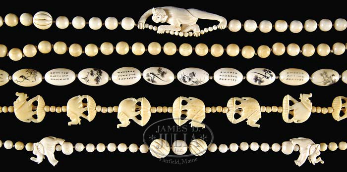 FIVE IVORY NECKLACES. 1) 23″ ivory bead necklace with large carved swirled beads in the center and two carved elephant figures; one on each side of center. Necklace is finished with an ivory screw clasp. 2) 19″ vegetable ivory bead necklace interspersed with 7 carved elephant figures. Necklace is finished with vegetable ivory screw clasp. 3) 23″ vegetable ivory bead necklace made up of 11.8mm vegetable ivory beads and a vegetable ivory screw clasp. 4) 21″ ivory bead necklace with hand-formed oval ivory beads. Each bead is scrimshawed with various scenes of birds. The back of each bead carries an inscription in Oriental figures. Necklace is finished with an Oriental design clasp marked on the backside “Silver”. 5) 30″ ivory bead necklace with 11.5mm round beads and a carved monkey on each side climbing up the necklace. PROVENANCE: From the Estate of Geraldine Gaba, Scottsdale, AZ. CONDITION: Very good to excellent. 5-68380 (400-600)