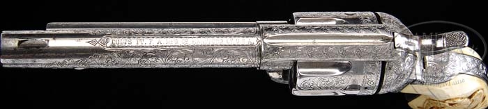 ENGRAVED COLT SINGLE ACTION ARMY REVOLVER. SN 161736. Cal. 38 WCF (38-40). Nickel finish with 5 1/2″ bbl, full front sight and 1-line block letter address with caliber marking on left side. Left side of frame has 2-line 3 patent dates and rampant colt in a circle. Revolver is fitted with 1-pc ivory grip having a deep carved eagle on a branch on the left side and a relief carved shield with confederate stars & bars over a fouled anchor. Grip is made of one solid piece of ivory. Revolver has about D-coverage, after-market, very fine, foliate arabesque pattern engraving with punch-dot background. Frame has nearly full coverage with only the bottom front gullets not engraved. Engraving patterns extend over the sides of the bbl nearly to the muzzle, on the outer radius of the ejector rod housing, onto the backstrap and trigger guard. Cylinder is engraved to match with foliate arabesque patterns on the lands between the flutes and in a band around the rear edge. Accompanied by a Colt factory letter identifying this revolver in 38-40 caliber with 5 1/2″ bbl, nickel finish, rubber grips and shipped to Simmons Hardware Co., St. Louis, MO. on November 27, 1895 in a one-gun shipment. CONDITION: Fine to very fine. Overall retains most of its fine custom nickel finish applied after engraving over scattered fine pitting, with slight wear at the muzzle end of the bbl and the hammer. Cylinder pin is battered. Grip has numerous age lines and a chipped right toe, otherwise is sound with a mellow ivory color, probably about the age of the revolver. Mechanics are fine, strong clean bore with scattered pitting. 4-38964 (5,000-7,000)