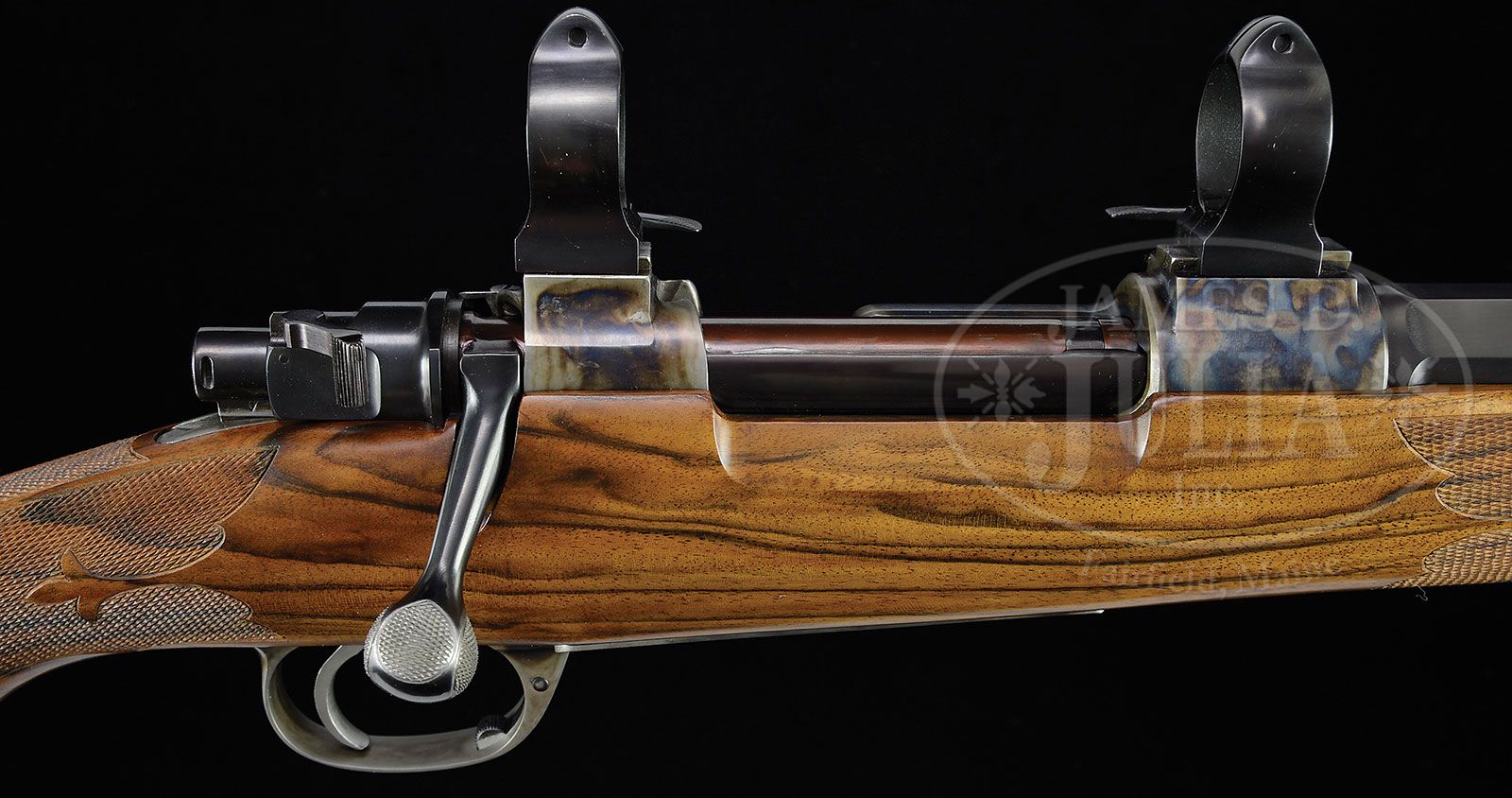 *C. P. DONNELLY CUSTOM DOUBLE SQUARE MAUSER. SN 12176E (stamped on bottom of action – out of stock). Cal. 35 Whelen. 24″ Medium weight, tapered, round bbl with octagonal section at breech, marked on top “C. P. Donnelly Grants Pass, OR.” (well known builder of fine target bbls), is engraved with caliber at left rear. Case hardened Mauser 98 action has been extensively reworked with addition of square bridge and second square addition to receiver ring, both dovetailed to accept Talley type QD rings (included). A Model 70 type trigger has been installed. Blued bolt has four panel checkered knob, handle swept back in FN style. An FN type bolt shroud has Model 70 type safety added. Custom Blackburn type bottom metal with hinged floorplate, has release at front of nicely shaped trigger guard bow. Beautifully marbled and lightly figured European walnut stock is crisply sculpted with swept shadow line right hand cheekpiece, and nicely shaped cut-out at magazine port in classic style. Stock also features sling eyes, skeleton steel grip cap, ebony forend tip, exceptionally well executed fleur-di-lis checkering, and a thin red Decelerator pad. Drop at heel: Approx 2-3/4″. Drop at comb: Approx 2-1/4″. Weight with rings: 8 lbs. 5 oz. LOP: 13-3/4″. CONDITION: Excellent, essentially as new. 4-48101 MGM116 (4,500-5,500)