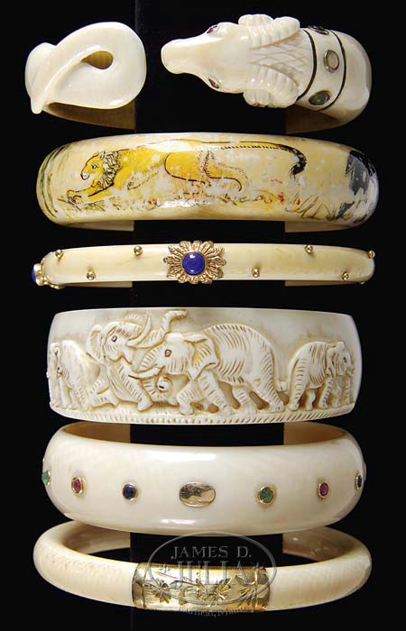 LOT OF IVORY BANGLE BRACELETS. Lot consists of seven ivory bangle bracelets; one carved with elephants, one painted with lions and tigers, one mounted with gold clasp and hinge, one set with tiny emeralds, sapphires and rubies, one carved with ram’s head and set with cabochon stones and one set with gold beads and lapis lazuli cabochons. PROVENANCE: From the Estate of Geraldine Gaba, Scottsdale, AZ. CONDITION: Mostly good. One plain ivory bracelet is broken, wear to painted ivory bracelet, spring broken in hinge on ram’s head bracelet. 5-68383 (300-500)